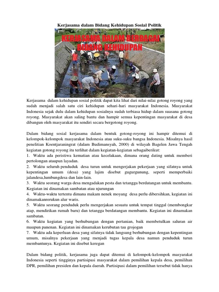 Contoh kerjasama dalam bidang kehidupan sosial politik. Globalisasi di bidang politik pengertian dampak pengaruh dan contohnya dosenpendidikancom pengertian globalisasi yang diambil dari kata global yang memiliki arti atau makna adalah universal. Masyarakat indonesia sejak dulu dalam kehidupan sosialnya sudah terbiasa hidup dalam suasana gotong royong. Peran indonesia dalam kerja sama antarnegara bidang politik berdasarkan prinsip bebas aktif dan keinginan untuk melaksanakan ketertiban dunia yang didasari kemerdekaan perdamaian abadi dan keadilan sosial bangsa indonesia aktif dalam kerjasama politik regional dan internasional. Politik sendiri berkaitan erat dengan pembentukan dan pelaksanaan kebijakan publik yang disusun oleh suatu negara. Bentuk dan contoh kerjasama dalam berbagai bidang kehidupan agama sosial politik ekonomi pertahanan dan keamanan 1 kerjasama adalah hal yang tidak dapat dilepaskan dari kehidupan manusia sebagai makhluk sosial. Dalam bidang politik kerjasama juga ditunjukan ketika bergotong royong mendirikan tempat pengumutan suara membantu mengamankan jalannya pengumutan suara dan lainnya.