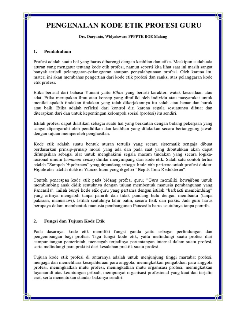 Contoh kode etik guru. Contoh kasus pelanggaran kode etik guru. Guru berbakti membimbing anak didik seutuhnya untuk membentuk manusia pembangun yang berjiwa pancasila. Didalam mengajar melatih membimbing dari para peserta didiknya guru harus bisa bersikap serta berperilaku dengan profesional. Kami guru indonesia bersatu dalam wadah organisasi perjuangan persatuan guru republik indonesia membina persatuan dan kesatuan bangsa yang berwatak kekeluargaankami guru indonesia menjunjung tinggi kode etik guru indonesia sebagai pedoman tingkah laku profesi dalam pengabdian terhadap bangsa negara serta kemanusiaan. Menurut kode etik guru indonesia hasil kongres pgri ke xx tahun 2008 kode etik guru indonesia adalah norma dan asas dan diterima oleh guru guru indonesia sebagai pedoman sikap dan peilaku dalam melaksanakan tugas profesi sebagai pendidik anggota masyarakat dan warga negara. Guru memiliki kejujuran profesional dalam menerapkan kurikulum sesuai dengan kebutuhan anak didik masing masing.