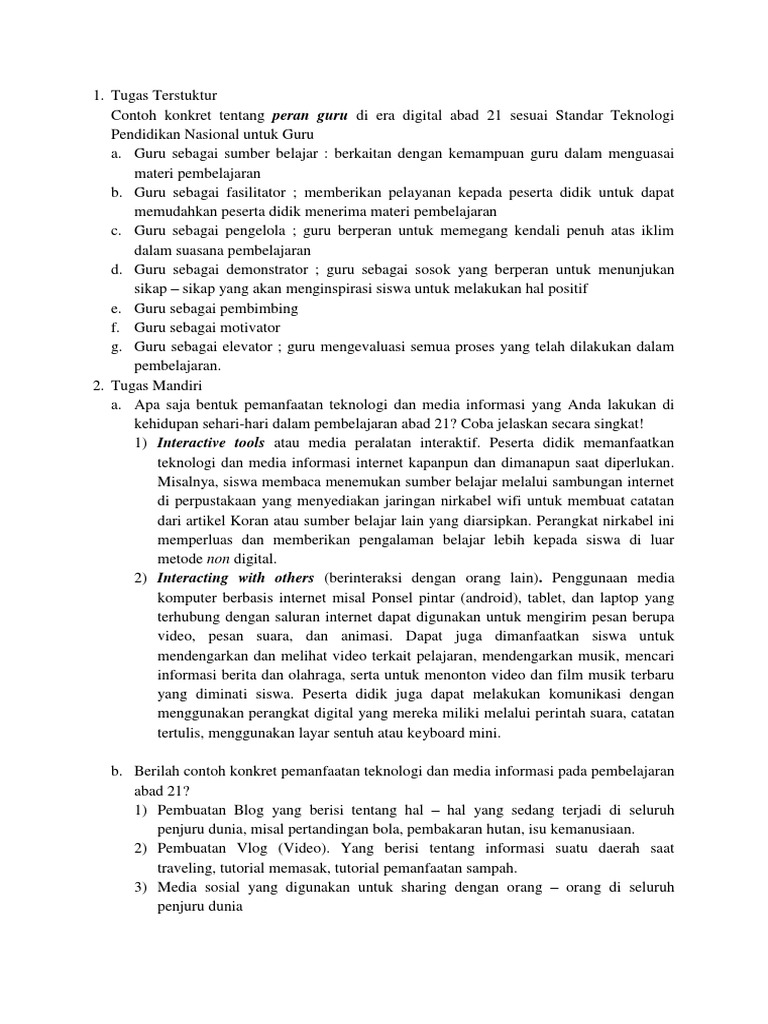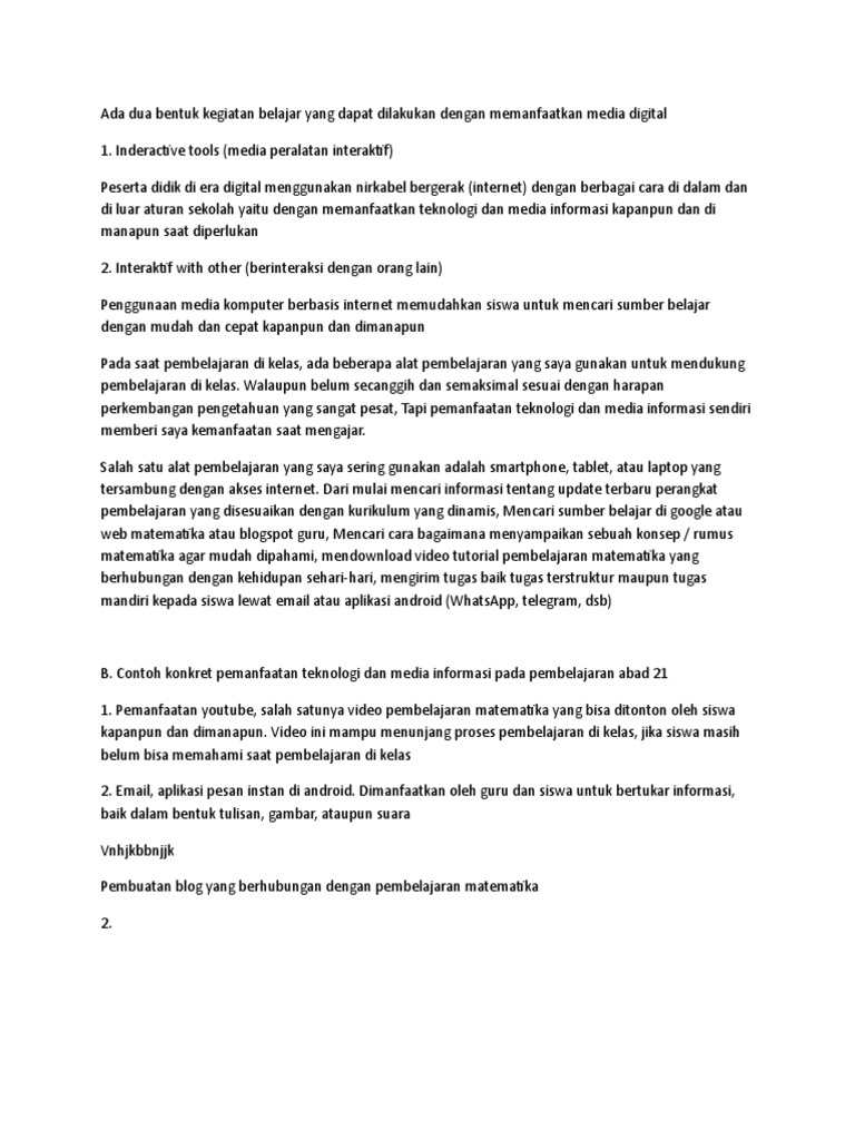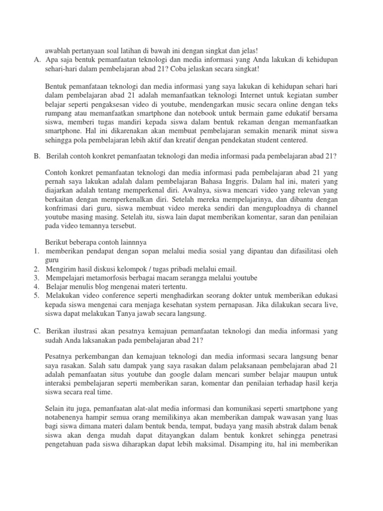Contoh konkret pemanfaatan teknologi dan media informasi pada pembelajaran abad 21. Teknologi menghubungkan dunia yang melampaui sekat sekat geografis sehingga dunia menjadi tanpa batas. 2011 penggunaan teknologi informasi dan komunikasi mendukung pergeseran praktek praktek budaya dalam proses belajar mengajar di perguruan tinggi. Portal rumah belajar digunakan untuk menemukan materi yang dibicarakan. Berilah contoh konkret pemanfaatan teknologi dan media informasi pada pembelajaran abad 21. Perkembangan dunia abad 21 ditandai dengan pemanfaatan teknologi informasi dan komunikasi dalam segala segi kehidupan. Contoh konkret pemanfaatan teknologi dan media informasi pada pembelajaran yang saya lakukan misalnya dalam pembelajaran materi bilangan berpangkat di kelas x.