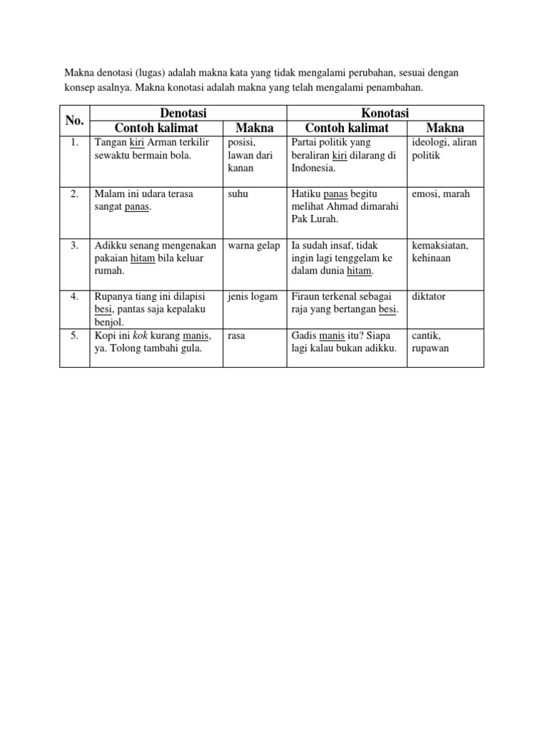 Berikut ini contoh kalimat yang mengandung makna konotasi dan denotasi. Sebelum berlanjut ke contoh kalimat yang mengandung konotasi ada baiknya adik adik memahami terlebih dahulu apa itu makna konotasi idiom ungkapan dan juga metafora. Makna denotasi merupakan makna sebenarnya dari suatu kata sedangkan makna konotasi adalah makna kiaas atau tidak sebenarnya yang terkandung dalam suatu kataagar kita lebih memahami kedua makna kata itu berikut ditampilkan beberapa contoh keduanya yang ditampilkan dalam format kalimat sebagaimana yang.