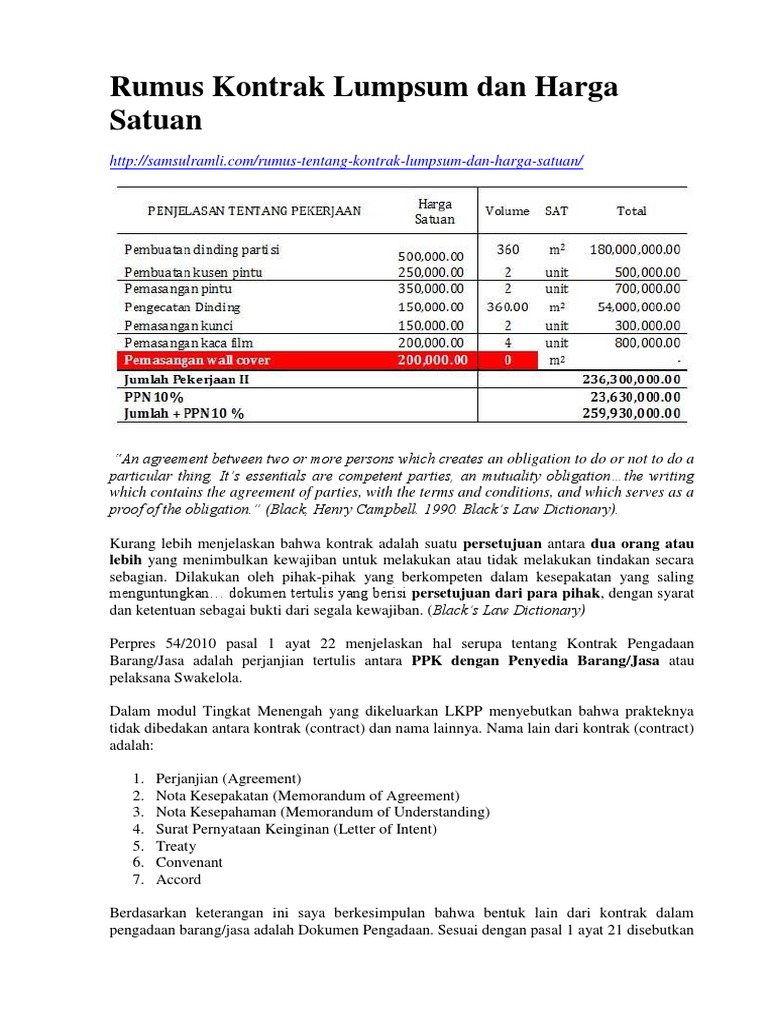 Jadi tegas dan jelas yang dimaksud nilai kontrak adalah total kontrak bukan harga satuan. Kontrak jasa travel jenis kontrak lumpsum misal nilainya 250 juta akan diubah menjadi kontrak harga satuan dengan alasan peserta semula 25 orang 25 x 10 juta250 juta yang jadi berangkat 15 orang 15 x 10 jt 150 juta. Nilai kontrak adalah total kontrak bukan harga satuan kontrak. Disini kita sajikan kumpulan analisa harga satuan pekerjaan persiapan beserta contoh perhitunganya masing masing dalam bentuk artikel tersendiri agar jelas. Apabila tetap menggunakan kontrak lumpum maka akan terjadi kelebihan pembayaran 250. Mau tanya pak kontrak harga satuan apakah boleh diadendum dan kalau melebihi tanggal pelaksanaan apa boleh diperlakukan denda reply delete.