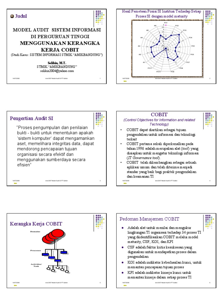 Salah satu penilaian proses audit ti menggunakan cobit. Pengaruh kualitas sistem informasi akuntansi terhadap pengendalian internal. Berdasarkan proses audit yang telah dilakukan maka dapat disimpulkan bahwa hasil dari rekapitulasi tingkat model capability skala penelitian audit tata kelola teknologi informasi di dinas komunikasi dan informatika kabupaten oku yaitu skala 3 established process dengan nilai 318 yang artinya dinas komunikasi dan informatika kabupaten oku ini sudah mengimplementasikan tata kelola teknologi.