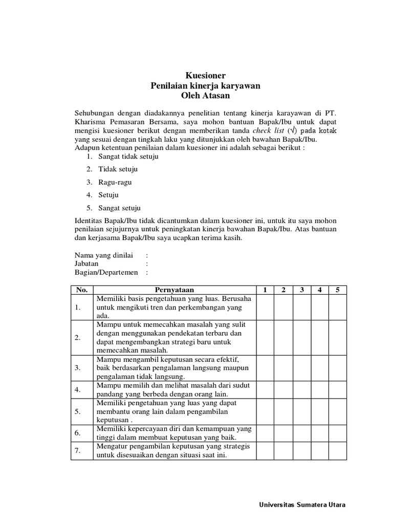 Contoh kuesioner penilaian kinerja karyawan manual. Sr skor 4 sering. Contoh kuesioner penelitian angket penelitian buat kamu yang mau melakukan penelitian di bawah ini saya berikan contoh kuesioner penelitian oleh salah satu mahasiswa di suatu kampus. Jawablah pertanyaan dibawah ini dengan memberikan tanda silang x pada kolom yang tersedia. Kuesioner yang baik biasanya terdiri dari surat permohonan menjadi responden lembar persetujuan menjadi responden dan kuesioner. Perusahaan tidak hanya menggunakan penilaian kinerja karyawan sebagai tolak ukur kinerja dari masing masing karyawan tetapi juga menggunakannya sebagai bahan administrasi kompensasi dan tujuan pengembangan para karyawan. Kk skor 3 kadang kadang.