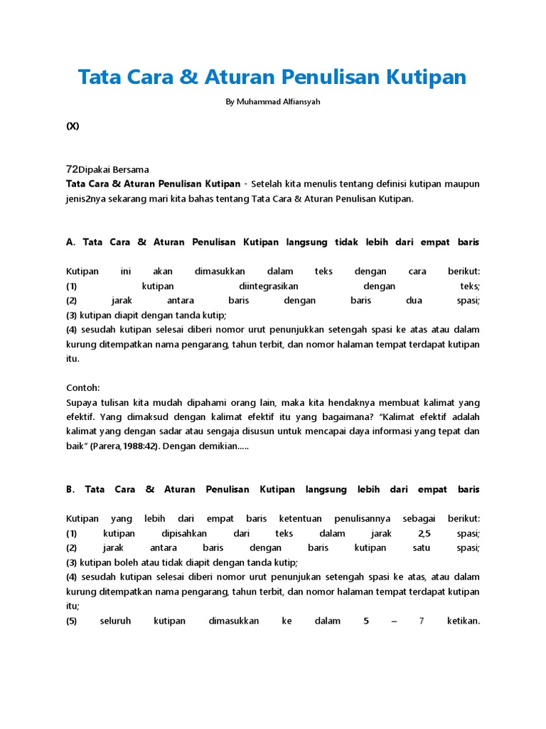 Contoh kutipan langsung lebih dari 4 baris. Kutipan tidak langsung lebih dari 4 baris. Hal ini dimaksudkan agar pembaca dapat mengetahui keaslian dari kutipan tersebut. Kutipan ialah pendapat dari seseorang yang dianggap terkenal atau kalimat derma yang diungkapkan oleh seseorang baik dalam majalah ataupun dalam buku. Jika kutipan langsung tadi kurang dari lima baris maka ditulis diantara tanda kutip sebagai bagian yang terpadu dalam teks. Cara menulis dan contoh kutipan langsung kurang dari 5 baris. Kutipan langsung pendek penulis mengutip sumber bacaan yang berjumlah kurang dari 4 baris teks yang dikutip termasuk sebagai bagian dari tulisannya dan juga sebagai kelanjutan dari tubuh penulisan bukan paragraf baru menggunakan formulir yang diekstraksi dalam bentuk.