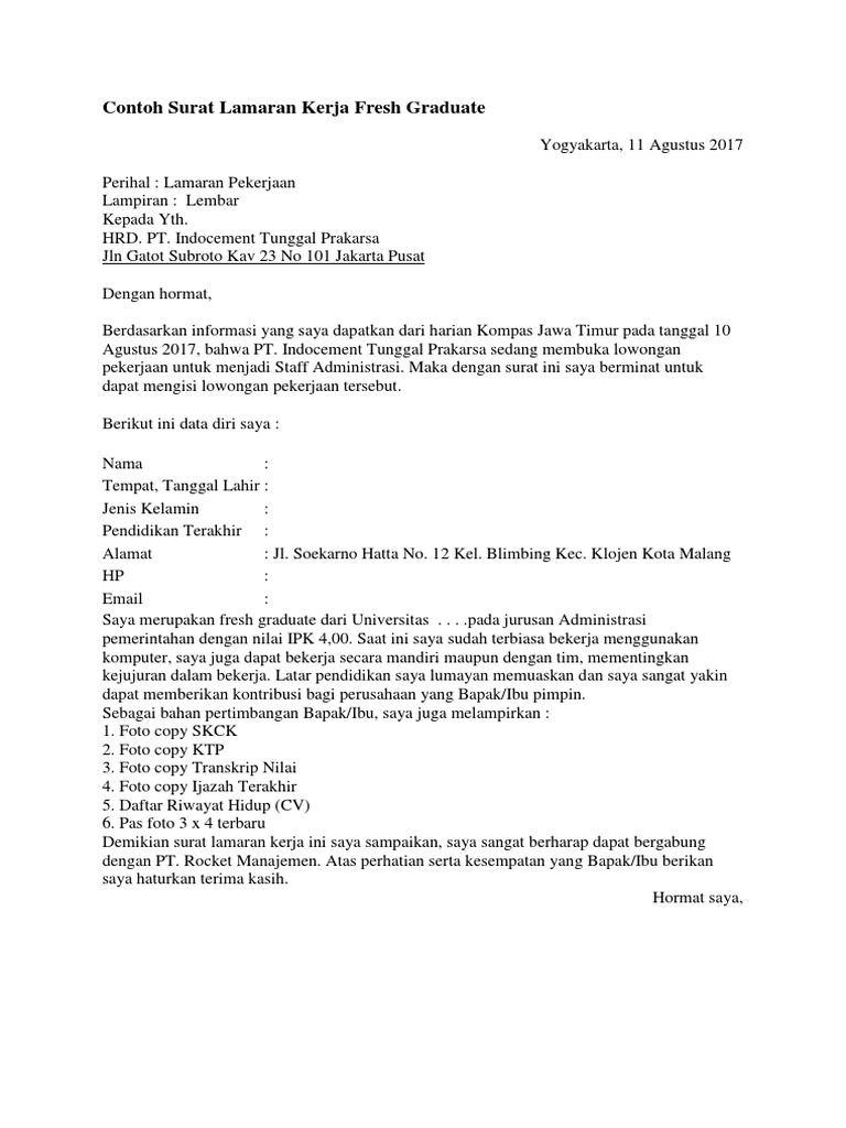 Contoh surat lamaran kerja dalam bahasa inggris untuk fresh graduate sebagaimana kita ketahui bersama banyak perusahaan yang lebih mengutamakan calon karyawan yang sudah berpengalaman namun tidak sedikit juga perusahaan yang lebih mencari calon karyawan yang masih baru tamat dari pendidikan. 10 contoh surat lamaran kerja fresh graduate baru lulus sma smk d3 dan s1 surat lamaran kerja mei 07 2020 1142 banyak yang mengatakan bahwa masa masa selepas kuliah disebut dengan fase life crisis. Surat lamaran kerja benar benar merupakan hal kebutuhan utama bagi kita para pencari kerja untuk mendapatkan pekerjaan yang layak apakah dari kita yang baru saja wisuda kuliah pindah kerja dari perusahaan lain mencari suasana yang baru ataupun. Mulai dari contoh surat lamaran kerja guru contoh surat lamaran kerja cpns contoh surat lamaran kerja di rumah sakit contoh surat lamaran kerja perawat indomaret dll. Contoh surat lamaran kerja fresh graduate ketika sudah menyelesaikan studi sekolah menengah atau lulus sarjana s1 tentu membuat para fresh graduate ingin segera melamar kerja dan memperoleh penghasilan bulanan hal ini wajar tentunya mengingat sebagian diantara mereka sudah sangat lelah dalam menempuh pendidikan dan ingin segera bekerja adapun cara yang mereka peroleh untuk mendapatkan. Di sinilah kamu harus memasukkan kegiatan ekstrakurikuler sekolah juga pekerjaan sukarela atau magang untuk menunjukkan kemampuan sosial komunikasi dan kepemimpinan.