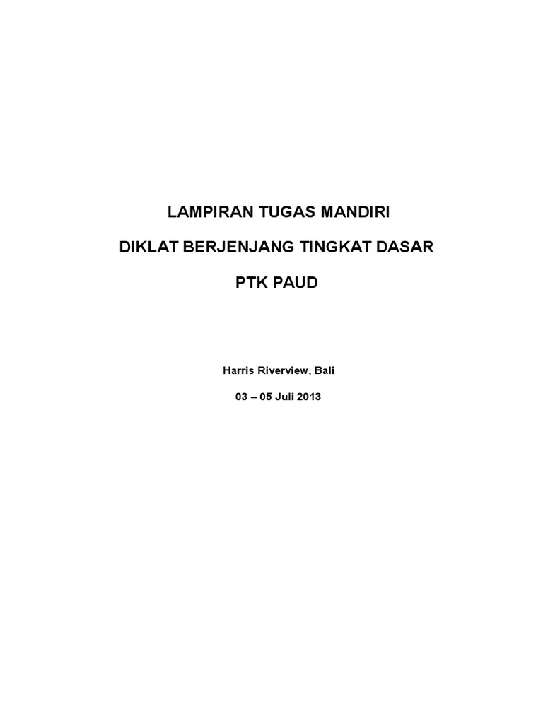 Contoh lampiran tugas mandiri diklat dasar paud. Jldiponegoro ungaran tanggal pelaksanaan diklat. Memahami konsep konsep dasar pengembangan pada anak usia dini khususnya anak usia 0 6 tahun. 08 sept sd 15 november 2014 tanggal pelaksanaan tugas mandiri. Lirik lagu lagu untuk bunda paud 7. Pelaksanaan tugas mandiri dilakukan bersamaan dengan pelaksanaan tugas keseharian sebagai pendidik paud dan dilakukan di lembaga paud tunas bangsa 02 prangas rt29 rw04 desa klepu kecamatan sumbermanjing wetan kabupaten malang. Laporan tugas mandiri diklat paud tingkat dasar bagi pendidik dan tenaga kependidikan anak usia dinipaud.