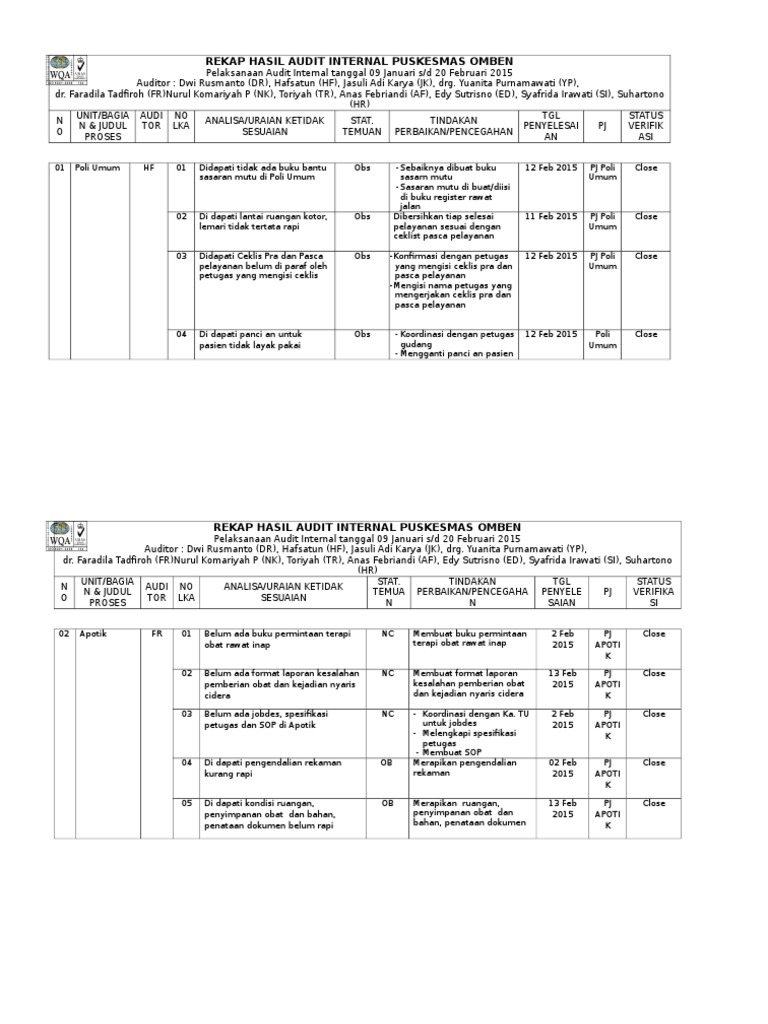 Contoh laporan audit internal puskesmas. Audit rencana dan program audit dokumen yang berlaku. Contoh lembar checklist amdal gedung. Uptd pusat kesehatan masyarakat kandangan jl. Pada pelatihan di lumajang tentang audit internal dibutuhkan contoh untuk melaksanakan audit internal audit internal area prioritas 7laporan contoh audit plan dan instrumen audit demikian untuk ukp draguscn. Berikut ini adalah download rpp silabus prota prosem kkm skkd ktsp 2006 sd kelas 5 yang merupakan kumpulan file dari berbagi sumber documentktsp 2006ktsp sdrpp silabus tentang contoh laporan audit internal akreditasi puskesmas. Une en iso iec 17025 dan audit internal laboratorium.