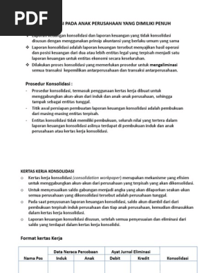 Laporan keuangan untuk entitas gabungan disusun dengan mengkonversi laporan keuangan perusahaan induk dan anak menjadi laporan konsolidasi yang merefleksikan posisi keuangan dan hasil operasi entitas gabungan. Konsolidasi dalam akuntansi yaitu penggabungan laporan semua aset ekuitas kewajiban dan akun operasional perusahaan induk dan anak perusahaan menjadi satu laporan keuangan. Suatu perusahaan menjadi perusahaan anak ketika perusahaan lain disebut sebagai perusahaan induk memperoleh pengendalian kepemilikan atas saham berhak suara yang bereda. Biasanya pengendalian kepemilikkan pada perusahaan lain diperoleh secara langsung dengan memperoleh hak mayoritas lebih dari 50 atas. Pengertian laporan keuangan konsolidasi. Neraca konsolidasi yaitu suatu neraca yang menunjukan kondisi keuangan dari gabungan induk dan anak perusahaan.