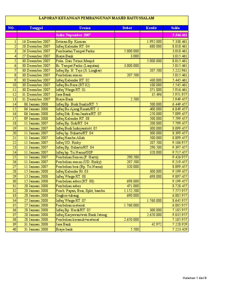 Perlahan tapi pasti banyak dari kita melakukan pembukuan untuk pengeluaran sehari hari. Sehubungan dengan pemberian dana hibah dari pemerintah kabupaten bantul kepada masjid al musyahadah di dusun xi jogonalan kidul tirtonirmolo kasihan bantul sebanyak rp 5000000 lima juta rupiah maka dari itu kami atas nama panitia dan pengurus takmir masjid al musyahadah memberikan laporan pertanggungjawaban tentang dana hibah yang rinciannya terlampir bersama surat ini. Sehubungan dengan pemberian dana dari masyarakat dan para donator maka dari itu kami atas nama panitia pembangunan masjid nur al iman megang sakti musi rawas sumatera selatan memberikan laporan pertanggungjawaban tentang dana sumbangan pembangunan masjid yang berasal dari masyarakat donator dan instansi swasta negeri yang rinciannya terlampir. Susunan takmir masjid al fath perum aph seturan baru per 01 muharram 1434 h 15 november 2012 dasar hukum. 56038852 februari 2016. Generasi orang tua saya menulis pembukuan di buku tulis sedangkan generasi muda saat ini sebagian sudah pasti menggunakan microsoft excel di laptop.