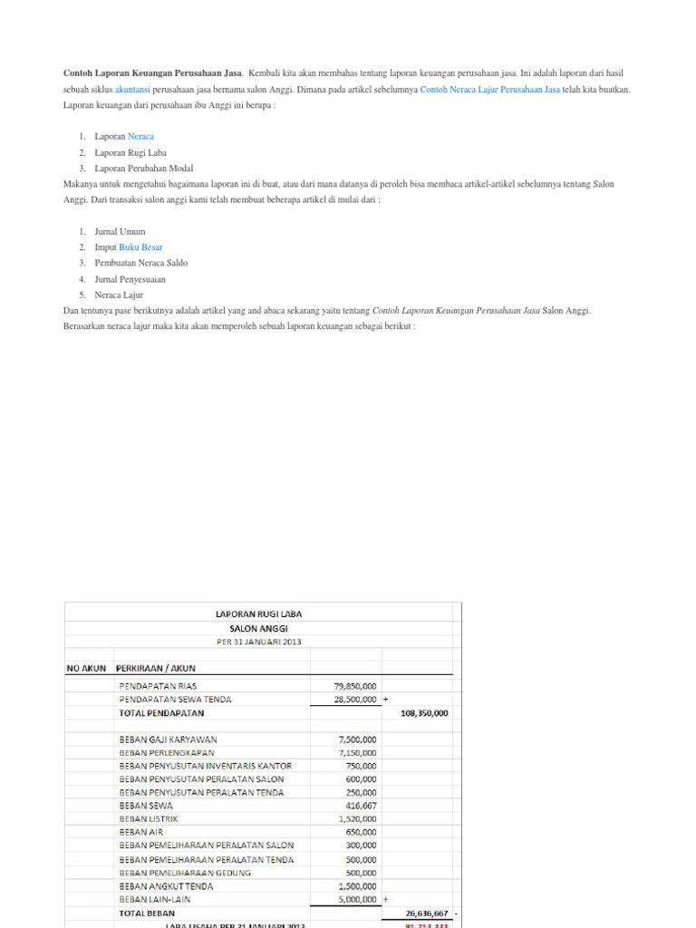 Sebelum masuk lebih dalam mengenai pembahasan inti ada baiknya kita mengenal terlebih dahulu apa itu perusahaan jasa. Contoh laporan keuangan perusahaan jasa. Ini adalah laporan dari hasil sebuah siklus akuntansi perusahaan jasa bernama salon anggi. Perusahaan dagang adalah perusahaan yang kegiatan usaha nya menjual suatu produk dari supplyer kepada konsumen dengan atau tanpa merubah baik bentuk rasa atau kualitas dan memperoleh keuntungan dari hasil selisih penjualan. Contoh laporan keuangan perusahaan jasa. Perusahaan jasa service company merupakan perusahaan yang bergerak dalam bidang penjualan jasa keahliancontoh perusahaan jasa seperti kantor akuntan publik usaha salon usaha bengkel bank asuransi lembaga pendidikan sekolah universitas klinik dokter kantor notaris perusahaan leasing rumah sakit usaha rental mobil jasa.