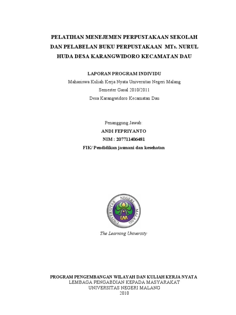 Laporan individu kuliah kerja nyata kkn diposting oleh bersamamu selamanya di 0621. Puji syukur penulis ucapkan kehadirat allah swt atas segala rahmat dan karunia nya sehingga penulis dapat menyelesaikan laporan kuliah kerja nyata kkn. Sehingga kita dapat menyelesaikan laporan kerja individu pada kkn uin sunan kalijaga yogyakarta angkatan ke 77 yang dilaksanakan di padukuhan ngoro oro desa giriasih kecamatan purwosari kabupaten gunungkidul propinsi di. Laporan individu kuliah kerja nyata kkn di desa hadiwarno kecamatan ngadirojo kabupaten pacitan oleh. Kecamatan seyegan kabupaten. Format laporan kkn kelompokindividu.