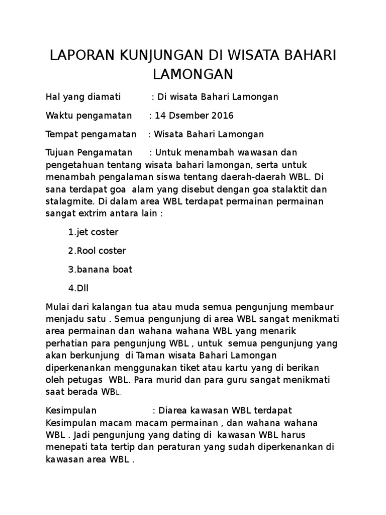 Contoh laporan perjalanan wisata. Laporan kegiatan study wisata ke bali tahun 2018. Di dalamnya dijelaskan beberapa poin yang pada intinya memberitahukan apa saja yang kita lakukan selama kegiatan perjalanan wisata tersebut secara lengkap dengan memeperhatikan urutan waktu dan tempat. Yogyakarta atau banyak orang sering menyebutnya dengan kata jogja adalah salah satu provinsi di indonesia dan termasuk salah satu dari 7 daerah istimewa selain aceh berau bulongan kalimantan barat kutai dan surakarta yang sampai sekarang hanya. Banyak tempat wisata yang bisa dikunjungi di kota ini seperti wisata alam wiasata sejarah wisata budaya. Contoh laporan karya wisata ke bali sabtu 15 oktober 2016. Sekarang kalian sudah tahu bagian bagian dari laporan yang harus disusun.