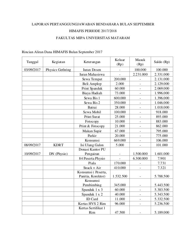 Laporan pertanggungjawaban bendahara lpj bendahara adalah laporan yang dibuat oleh bendahara penerimaanpegeluaran atas uangsurat berharga yang dikelolanya sebagai pertanggungjawaban pengelolaan uang. Pmk 162pmk052013 dan perdirjen. Per 03pb2014 tentang petunjuk teknis penatausahaan pembukuaan dan pertanggungjawaban bendahara pada satuan kerja pengelola. Laporan pertanggungjawaban laporan pertanggungjawaban lpj contoh bendahara formatnya laporan pertanggungjawaban adalah suatu dokumen tertulis yang disusun dengan tujuan memberikan laporan tentang pelaksanaan kegiatan dari suatu unit organisasi. Seluruh aliran keuangan disini mulai dari rencana anggaran dana evaluasi dana per kegiatan maupun kondisi keuangan internal departemen. Raimuna cabang kota malang.