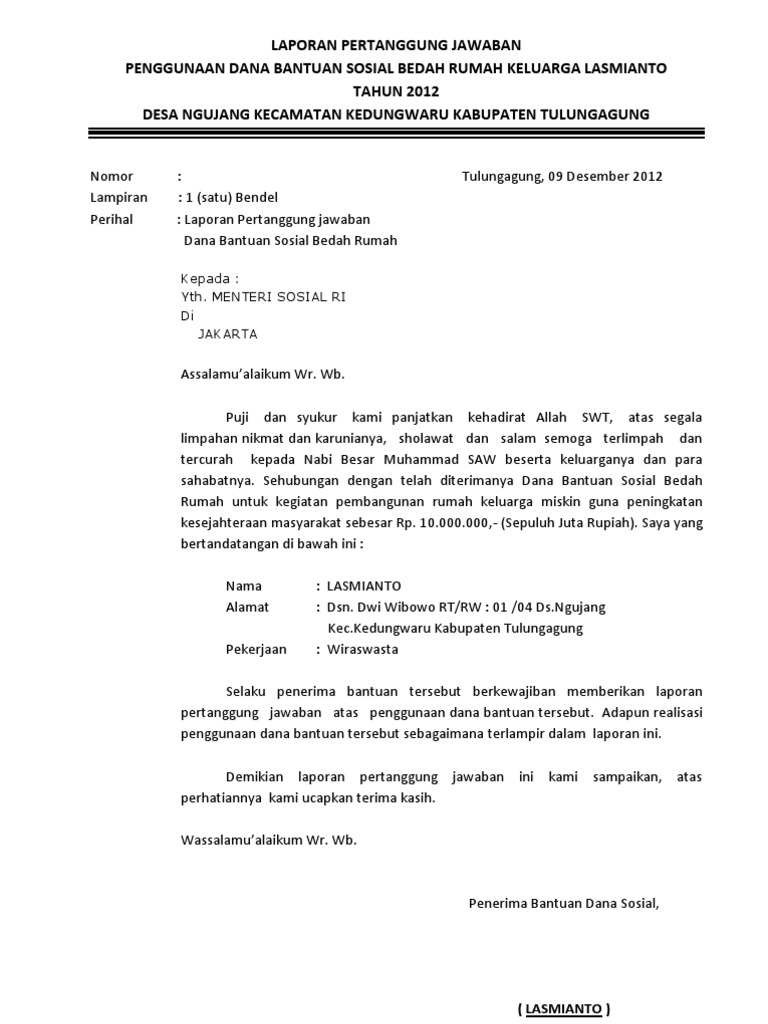 Contoh laporan pertanggungjawaban penggunaan dana hibah. Contoh laporan pertanggung jawaban lpj bantuan dana desa kata pengantar dengan memanjatkan fuji dan syukur kehadirat alloh swt atas segala rahmat dan karunia nya kami dapat menyelesaikan program kegiatan sebagaimana yang kita harapkan dengan telah selesainya pelaksanaan kegiatan bantuan dana desa tahap 1 tahun 2015. Kami ingin berbagi barang kali ada yang membutuhkan contoh laporan silahkan download link di bawah ini. Laporan pertanggungjawaban dana hibah. Pengertian dana hibah menurut pengertian yang tertera di wwwdanahibahwebid hibah adalah pemberian bantuan uangbarang atau jasa dari pemerintah daerah kepada pemerintah atau pemerintah daerah lainnya perusahaan daerah masyarakat dan organisasi kemasyarakatan yang. 6 batang 150000 150000 100 8 kran ¾ 6 buah 300000 300000 100 penirima belanja hibah saimin laporan penggunaan belanja hibah dari pemerintah kabupaten cirebon tahun anggaran 2014 perehaban tempat wudhlu musholla al ikhlas musholla al ikhlas sekretaris. Demikian laporan pertanggung jawaban ini kami buat dengan sebaik baiknya dengan harapan laporan kegiatan ini dapat menjadi acuan demi perkembangan kegiatan kegiatan serupa pada periode berikutnya.