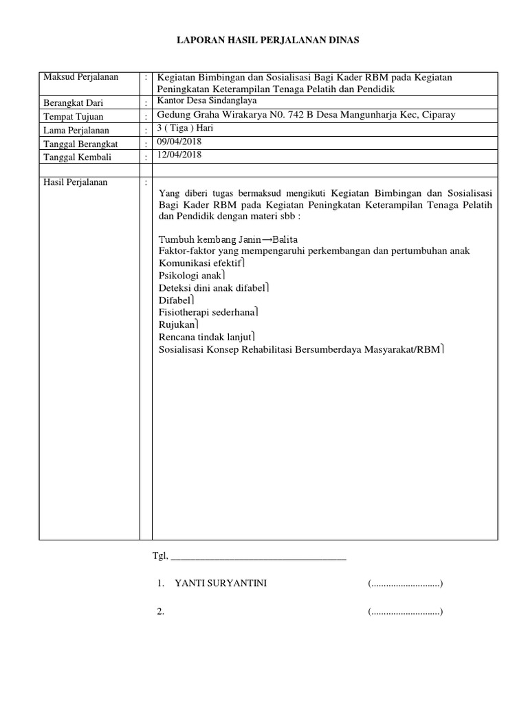 Peraturan menteri ini mengatur mengenai pelaksanaan dan pertanggungjawaban perjalanan dinas bagi pejabat negara pegawai negeri dan pegawai tidak tetap. Perjalanan dinas ke puskesmas biatan lempake dalam rangka monitoring dan evaluasi penyelenggaraan program jamkesmas jampersal dan jamkesda pada pelayanan kesehatan dasar di puskesmas. Demikian laporan pertanggungjawaban ini kami buat sebagai tanggung jawab kami untuk melaporkan hasil kegiatan yang telah kami laksanakan ke dinas kesehatan kota malang. Laporan pertanggungjawaban lpj perjalanan dinas dinas kesehatan kota malang dalam perkemahan bakti nasional. Bagaimana contoh laporan perjalanan dinas konsultasi dan koordinasi. Namun jika dalam laporan pertanggungjawaban ini ada suatu hal yang.