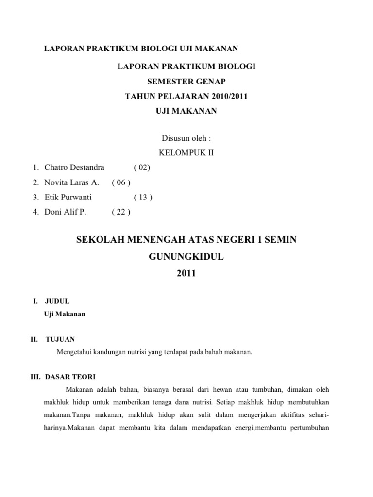 Laporan praktikum uji makanan karbohidrat protein lemak dan glukosa posted on 1548by unknown with 12 comments. Puji syukur kita panjatkan kepada allah tuhan yang maha esa karena atas berkat dan limpahan rahmat nyalah maka kita dapat menyelesaikan laporan praktikum ini dengan tepat waktu berikut ini kami mempersembahkan sebuah laporan praktikum yang berjudul laporan praktikum biologi uji zat makanan yang menurut kami dapat memberikan manfaat yang besar bagi kita untuk mempelajari lebih lanjut. Tujuan umum kegiatan uji coba zat makanan adalah kita dapat mengidentifikasi zat makanan yang terdapat didalam berbagai bahan makanan yang telah ditentukan. Laporan praktikum biologi semester genap tahun pelajaran 20102011 uji makanan disusun oleh. Untuk mengetahui kandungan zat nutrient yang terdapat dalam bahan makanan digunakan indicator uji makanan yang biasa dikenal dengan istilah reagen. Contoh grafik hasil praktikum perkecambahan sel pipi manusia percobaan betadin dan daun kelor laporan amilum pada daun laporan praktikum pengujuian vitamin c uji amilosa pada makanan uji boraks lembar kerja laporan pemeriksaan kadar boraks pada makanan laporan praktikum dunia tumbuhan alat dan bhan pemeriksaan urine uji boraks contoh.