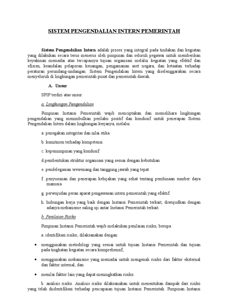 Contoh laporan sistem pengendalian intern pemerintah. Laporan penyelenggaraan spip di kantor kementerian agama kemenag kabupaten karimun ini dalam penyusunannya mengacu kepada peraturan pemerintah nomor 60 tahun 2008 tentang sistem pengendalian intern pemerintah dan peraturan menteri agama nomor 24 tahun 2011 tentang penyelenggaraan sistem pengendalian intern pemerintah di lingkungan kementerian agama serta peraturan kepala bpkp nomor. Peraturan penyelenggaraan sistem pengendalian intern pemerintah ini dimaksudkan untuk dijadikan pedoman dalam menerapkan 5 lima unsur sistem pengendalian intern pemerintah dengan. Penilaian risiko penilaian risiko merupakan salah satu unsur penting dalam penerapan spip. Sistem dimaksud adalah sistem pengendalian intern pemerintah atau sering disingkat dengan spip. Pengertian sistem pengendalian intern menurut pp nomor 60 tahun 2008 tentang spip adalah. Laporan sistem pengendalian intern pemerintah spip kantor lingkungan hidup kabupaten kulon progo tahun 2015 kantor lingkungan hidup kabupaten kulon progo 2016.
