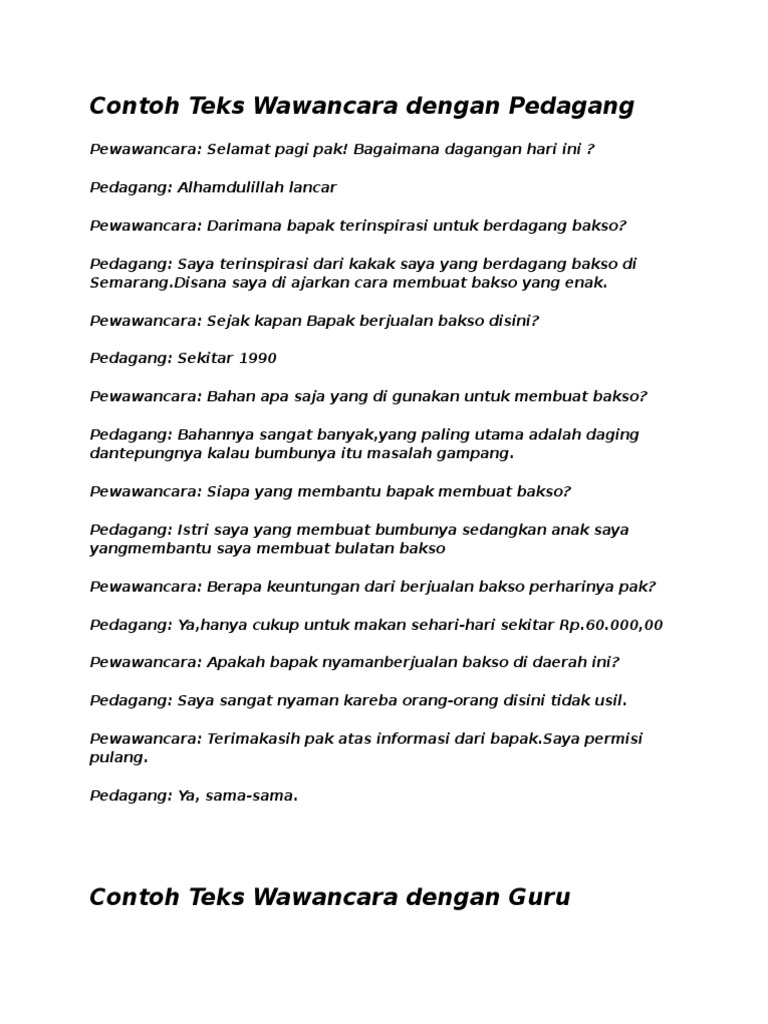 Wawancara diperlukan untuk mendapatkan informasi dari narasumber tentunya hasil wawancara yang baik harus di lampirkan dalam bentuk laporan dengan tujuan mempermudah untuk memahami hasil dari wawancara tersebut berikut contoh laporan hasil wawancara terhadap anak usia sd dengan tujuan untuk mengetahui sejauh mana daya simak anak terhadap metode yang disampaikan. Contoh wawancara dengan pedagang narasumber dari sebuah wawancara haruslah orang yang berkompeten dengan harapan informasi yang diberikan juga valid serta bisa dipercaya dan dipertanggungjawabkan. Kami memilih topik pedagang bakso karena bakso merupakan makanan khas indonesia yang terbuat dari daging sapi sehingga kami dapat mengetahui bagaimana cara membuat bakso dan lebih mengenalnya. Entah itu narasumber. Contoh laporan hasil wawancara. Kegiatan wawancara merupakan salah satu tugas di mata kuliah akhlak tasawuf yang bertujuan untuk memperoleh informasi dari narasumber oleh karena itu kami mewawancarai seseorang dosen akhlak tasawuf yaitu bapak ahmad ridwan.