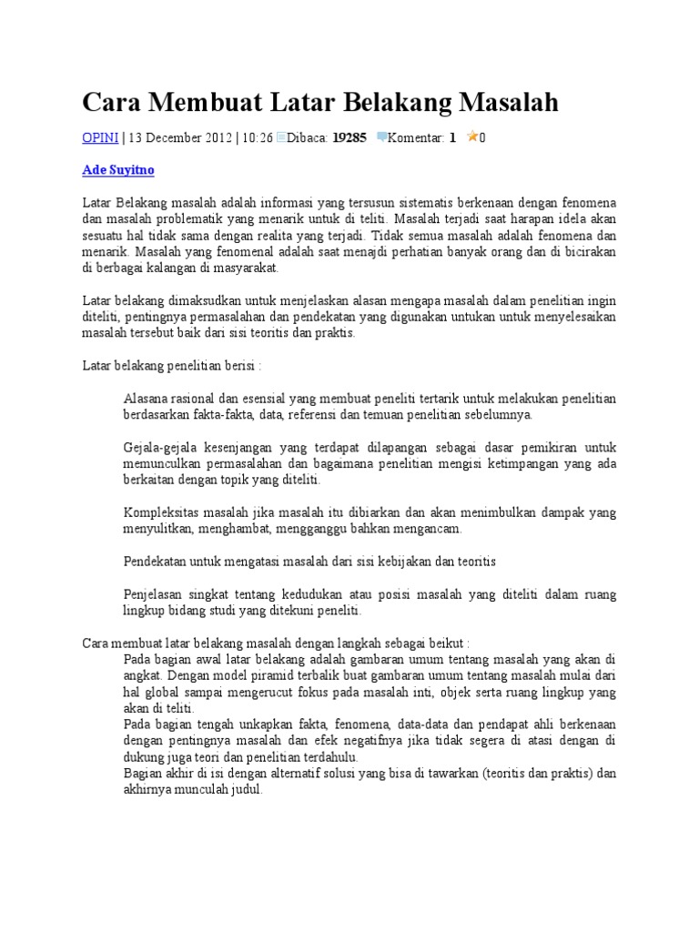 Contoh latar belakang yang baik. Jadi usahakanlah untuk bisa memilih topik yang sebaik baiknya agar anda tertarik untuk membahasnya untuk tulisan yang sedang dibuat. Contoh lengkap latar belakang skripsi latar belakang skripsi adalah dasar atau titik tolak untuk memberikan pemahaman kepada pembaca atau pendengar mengenai apa yang ingin kita sampaikan pada skripsi yang akan kita tulis. Dalam pembuatan makalah laporan perjalanan skripsi dan beberapa karya ilmiah yang lainnya latar belakang sangat penting sekali. Di dalam latar belakang masalah ini seolah olah peneliti sedang menjadi seorang detektif yang sedang mengamati lingkungan di tempat kejadian perkara. Latar belakang juga harus ditulis dengan baik dan maksud yang jelas. Mungkin bagi yang baru pertama kali membuat makalah akan mengalami banyak kesulitan dalam menyusun makalah terutama pada bagian latar belakang makalah.