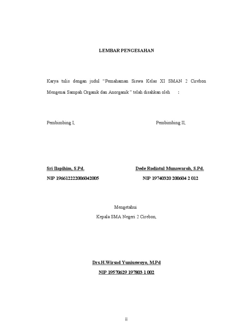 Contoh lembar pengesahan karya ilmiah. Lembar pengesahan sangat penting dan wajib dalam penyusunan makalah. Lembar pengesahan karya tulis ilmiah berbagi kebutuhan dalam penulisan karya tulis ilmiah sangatlah dibutuhkan bukan hanya soal bagimana menulis yang baik. Pemanfaatan buah kecubung sebagai racun alternatif pembasmi hama tikus yang bertujuan untuk. Format lembar persetujuan dan lembar pengesahan merupakan sebuah syarat dalam pembuatan penelitian di prabab atau sebelum bab i baik itu pada ptk tesis karya ilmiah dan skripsi yang sangat pentingtanpa adanya lembar persetujuan dan lembar pengesahan ini sebuah penelitian tidak dinyatakan sah. Sedangkan secara spesifik jika membahasa pengesahan yang berkaitan dengan karya tulis ilmiah atau suatu kegiatan yang kita kenal dengan lembar pengesahan atau halaman pengesahan dalam karya tulis ilmiahsuatu kegiatan macam macamnya antara lain diantaranya yaitu. Maka dari itu bagi guru siswa dan mahasiswa ataupun pegawai negeri pasti sangat membutuhkan.