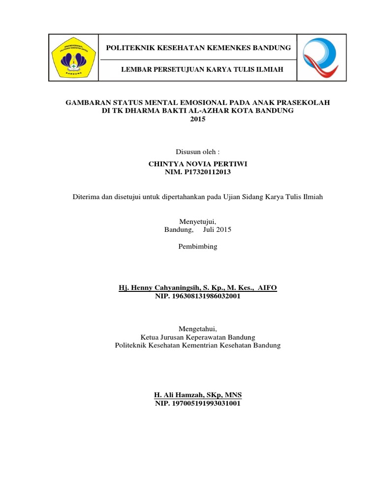 Lembar pengesahan karya tulis ilmiah berbagi kebutuhan dalam penulisan karya tulis ilmiah sangatlah dibutuhkan bukan hanya soal bagimana menulis yang baik. Lembar pengesahan dalam sebuah penelitian yang dilakukan oleh masing masing peneliti memiliki keperluan yang berebeda beda setiap format laporanya. Karya tulis ilmiah yang berjudul pengaruh film kartun terhadap perkembangan psikologis anak sdnegeri 3 maros kelas 4 dan 5 ini diajukan sebagai tugas dalam kurikulum bhsindoesia tahun pelajaran 20132014 di sma negeri 1 ssn maros dan dinyatakan telah mendapat persetujuan sebagai karya tulis ilmiah. Sedangkan secara spesifik jika membahasa pengesahan yang berkaitan dengan karya tulis ilmiah atau suatu kegiatan yang kita kenal dengan lembar pengesahan atau halaman pengesahan dalam karya tulis ilmiahsuatu kegiatan macam macamnya antara lain diantaranya yaitu. Kumpulan karya tulis ilmiah dan makalah untuk membantu menyelesaikan tugas sekolah maupun kuliah sebagai referensi tugas. Format lembar persetujuan dan lembar pengesahan merupakan sebuah syarat dalam pembuatan penelitian di prabab atau sebelum bab i baik itu pada ptk tesis karya ilmiah dan skripsi yang sangat pentingtanpa adanya lembar persetujuan dan lembar pengesahan ini sebuah penelitian tidak dinyatakan sah.