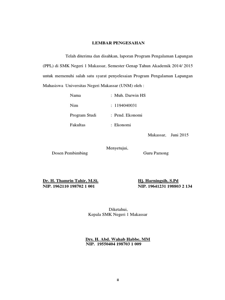 Contoh lembar pengesahan laporan. Pada contoh di bawah ini adalah lembar pengesahan yang dibuat oleh unis atau universitas negeri semarang tentang laporan kegiatan yang dilakukan. Contoh halaman pengesahan dalam penyusunan makalah atau karya tulis format dasar telah menjadi landasanformat makalah terdiri dari sampul atau cover makalah lembar pengesahan kata pengantar dan seterusnya. Memang tidak mudah menyusun halaman pengesahan untuk laporan yang sesuai dengan kaedah penulisan yang bagus sesuai standar. Ketika anda akan membuat sebuah laporan atau makalah pastinya akan ada lembar pengesahan. Contoh laporan pkl bab 2. Contoh lembar pengesahan laporan prakerinpkl smk.