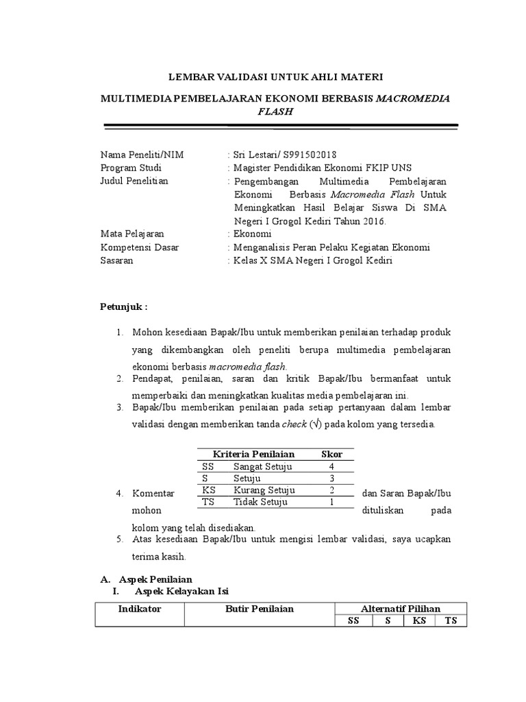 Apakah media yang dibuat patut digunakan dalam situasi situasi tertentu atau apakah media tersebut benar benar efektif atau tidak setelah media tersebut diperbaiki dan disempurnakan. Sebagai pedoman anda untuk mengisi kolom kolom validasi isi bahasa soal dan kesimpulan perlu dipertimbangkan hal hal berikut. Saya merasa tertantang untuk mengerjakan soal soal dalam media pembelajaran ini 10. Berikut penulis share contoh format atau indikator penilaian media aplikasi dalam penelitian pengembangan. Lembar validasi dan penilaian pengembangan media pembelajaran lembar validasi ahli aspek isi materi. 1 kesesuaian soal dengan indikator pencapaian hasil belajar.