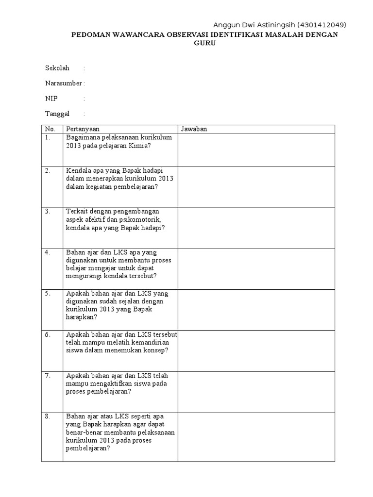 Contoh lembar wawancara untuk guru. Adapun pada pembahasan berikut ini yang membahas mengenai pedoman wawancara penelitian didalam belajar menyusun bagian bagian skripsi yang akan diuraikan yakni sebagai berikut. Di tengah wabah pandemi covid 19 yang sampai saat ini belum selesai secara langsung ataupun tidak telah berpengaruh pada dunia pendidikan. Contoh kecil saja ada murid yang melakukan tindakan yang kurang baik diluar sekolah pasti ditanya gurunya siapa sekolah dimana seperti itu. Contoh rpp 1 lembar kelas 6 mode daring. Contoh instrumen ptk lembar observasi aktivitas guru setelah menerbitkan tulisan mengenai contoh lembar observasi aktivitas siswa dalam pembelajaran menulismengarang kali ini kembali blog penelitian tindakan kelas akan memberikan contoh lembar observasi yaitu lembar observasi aktivitas guru dalam pembelajaran. Pengaruh itu dirasakan pada daerah daerah yang mesih menjadi zona merah atau zona rawan pandemi.