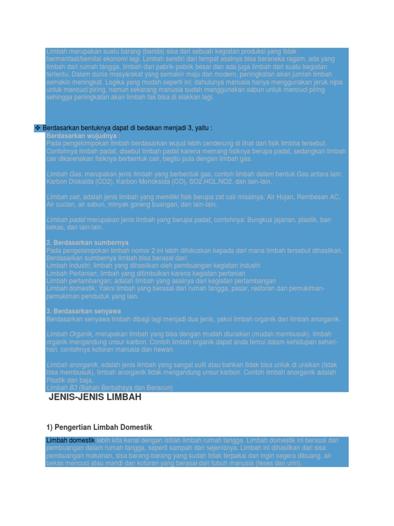 Menurut peraturan pemerintah pengertian limbah adalah bahan barang sisa atau bekas dari suatu kegiatan atau proses produksi yang fungsinya sudah berubah dari aslinya. Macam macam limbah industri beserta contoh dampak dan upaya menanganinya terlengkap limbah adalah buangan yang dihasilkan dari proses produksi baik dari industri ataupun domestik rumah tangga. Limbah yang dihasilkan dari kegiatan industri kebanyakan tergolong ke dalam jenis limbah b3. Diantaranya adalah logam berat oli pembersih lantai. Limbah industri selain kegiatan rumah tangga kegiatan industri memberikan andil yang sangat besar dalam pencemaran dan perubahan lingkungan. Ada banyak contoh limbah di sekitar kita dari berbagai jenis seperti limbah organik dan anorganik limbah padat cair dan gas serta limbah b3.