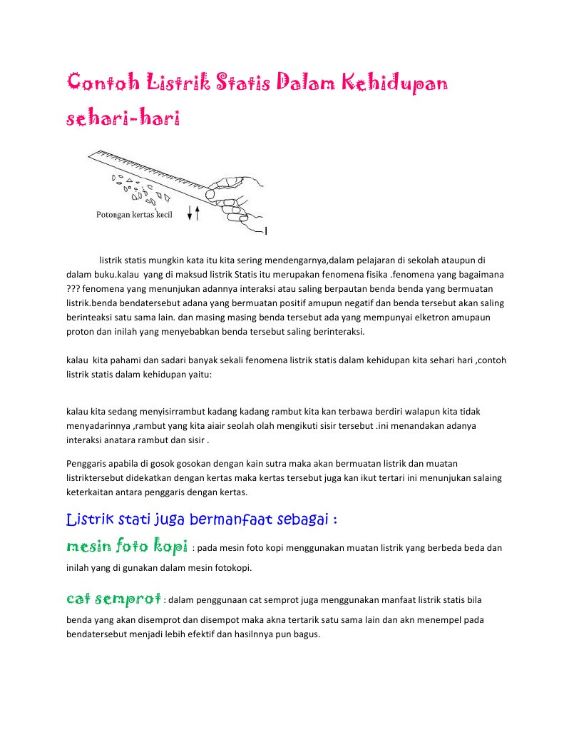 Contoh listrik statis dalam kehidupan sehari hari. Listrik statis dapat diartikan sebagai berkumpulnya muatan muatan listrik pada suatu benda. Terjadinya petir merupakan contoh dari listrik statis yang sering kita jumpai pada saat cuaca mendung. 10 bentuk penerapan listrik statis dalam kehidupan sehari hari. Dalam kehidupan sehari hari secara tidak sadarberkaitan dengan listrik statis. Penggaris di gosok gosokkan ke rambut kemudian bisa mengangkat potongan kertas kecil. Saat anda menyisir rambut tanpa disadari terkadang rambut akan terbawa berdiri sendiri beriringan dengan gerakan sisir.