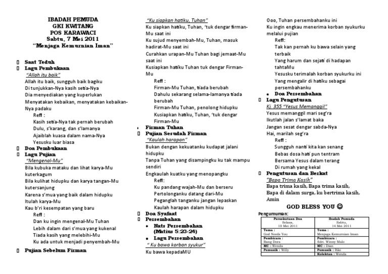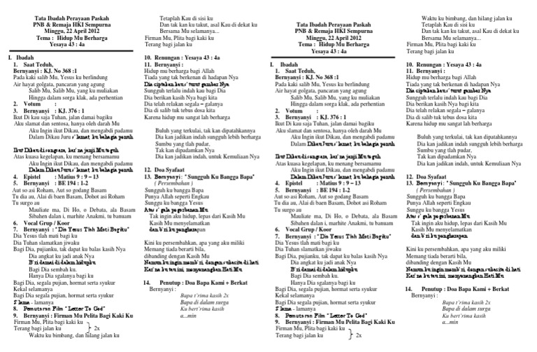 Hari ini kita merayakan keselamatan kita. Contoh liturgi ibadah singkat. Bersorak soraklah bagi tuhan hai seluruh bumi. Saya punya kisahcerita singkat tentang liturgiliturgos ini saya festus syet ini nama lengkapku saya mulai bergabung dalam unsure ibadah jemat di jemaat onomi felavauw jof sentani sejak bulan oktober 2011. Contoh susunan liturgi ibadah air kehidupan i. Dengan banyak mempertanyakan kualitas dan sumbangan hidup untuk kebaikan akan memberi motivasi diri untuk membuat hidup dan kehidupan menjadi lebih baik itulah ajaran tuhan allah kepada umat manusia menjadi lebih baik mengakhiri hidup dengan kebahagiaan.
