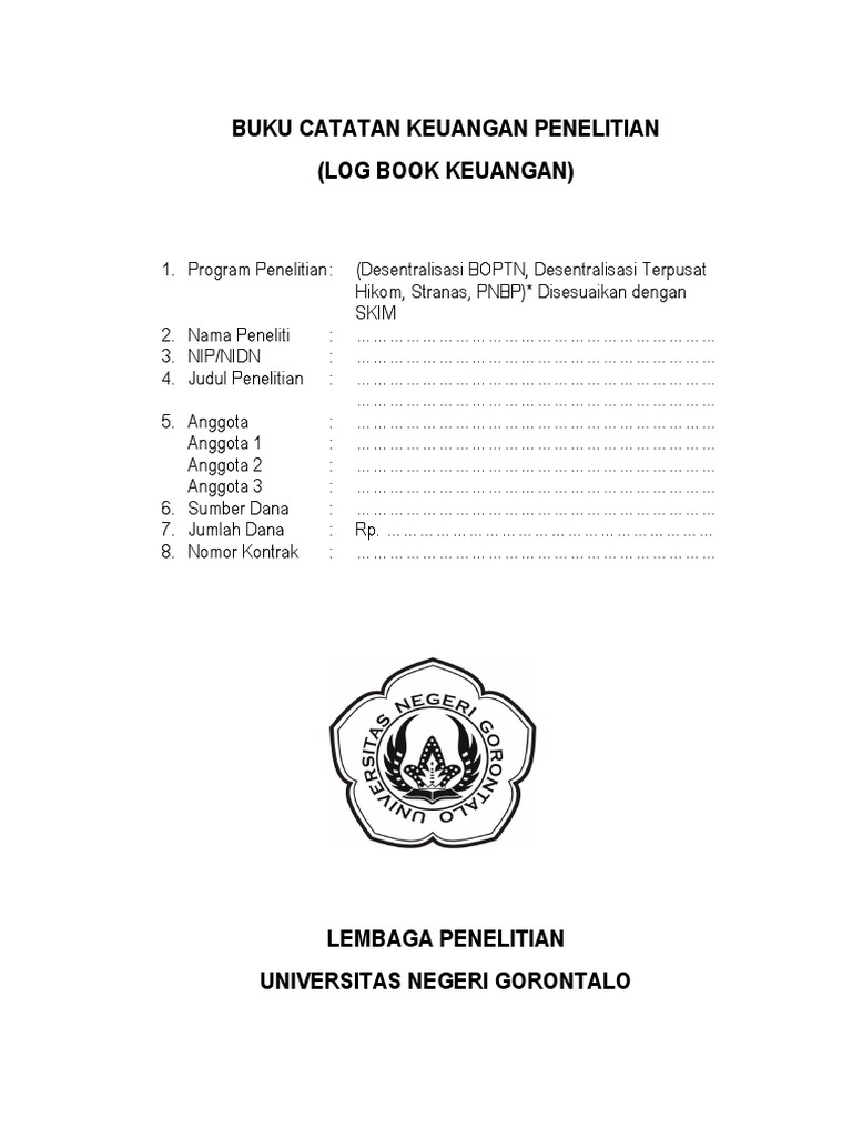 Selain melakukan penelitian dan membuat laporan penelitian dosen atau peneliti disibukan untuk membuat laporan keuangan dari mencatatkan ke log book setiap harinya melaporkan pengguna anggaran serta membuat nota nota penggunaan keuangan yang mengaju kepada peraturan mentri keuangan dan belum lagi dana datang terlambat dan tiba tiba karena ada masalah teknis atau yang lainnya. Log book program hibah pdi 2 judul penelitian analisis value co creation zocha menggunakan business model canvas ketua peneliti dini turipanam alamanda 12861072 1 anggota peneliti osa omar sharif 13781210 1 ayu ardhillah 1201110317 mi atikah 1201110253 fakultas ekonomi dan bisnis universitas telkom. Sebelum diberi perlakuan terlebih dahulu dilakukan uji normalitas uji kesamaan dua variandan uji keseimbangan. 4 dilaksanakan sesuai yang dicatat pada logbook seperti instrumen foto dokumentasi bukti pengumpulan data analisis data dan bukti pembayaran pembelian barang dan lain lain ke laman lppm simpen untuk penelitian atau ke simas untuk pengabdian. Hasil penelitian menunjukkan adanya pengaruh positif pembelajaran. Log book penelitian dibuat di atas kertas ukuran a4 tanpa dilakukan penjilidan tetapi dimasukan ke dalam ordner bintex dengan terlebih dahulu kertas tersebut dibolongi menggunakan perforator alat pembolong kertas.