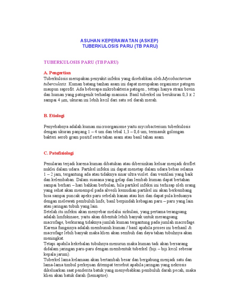 Asuhan keperawatan pada klien dengan tuberculosis. Bakteri ini lebih sering menginfeksi organ paru paru dibandingkan bagian lain tubuh manusia. Center transaksi bisnis pulsa. Penyakit tb paru merupakan penyakit menahunkronis berlangsung lama dan menular. Penyakit ini dapat diderita oleh setiap orang tetapi paling sering menyerang orang orang yang berusia antara 15 35 tahun terutama mereka yang bertubuh lemah kurang gizi atau yang tinggal satu rumah dan berdesak desakan bersama penderita tbc. Kata pengantar puji syukur kami ucapkan atas kehadirat allah swt.