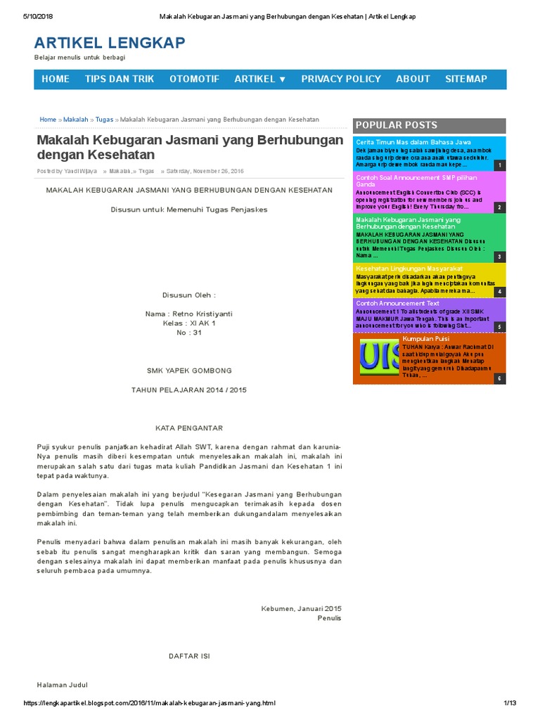 Contoh makalah kebugaran jasmani. Matari makalah tes kebugaran jasmani yang meliputi dari pengertian jenis jenis manfaat hakekat kebugaran contoh dan gambar supaya mudah di pahami. Unsur unsur kebugaran jasmani yang berhubungan dengan konsep kebugaran jasmani dalam kehidupan sehari hari terdiri dari kekuatan kelenturan dankeseimbanganbentuk bentuk latihan kekuatan kelenturan dan keseimbangan yang dapatdilakukan dengan cara yang mudah dan murah namun menghasilkan kebugaranyang maksimal apabila dilakukan dengan benar teratur dan dalam jangka waktuyang lama. Contoh gerakan dalam latihan kelenturan dinamis. Raya muncang cipanas lebak banten kata pengantar. Kebugaran jasmani pada hakekatnya manusia tentunya sangat perlu untuk memperhatikan kesehatan pada tubuh karena kesehatan adalah modal yang utama untuk melakukan aktifitas yang lainnya. Makalah kebugaran jasmani ini akan memberikan pembahasan materi dari segi arti definisi pengertian unsur unsur komponen manfaat dan tujuan.