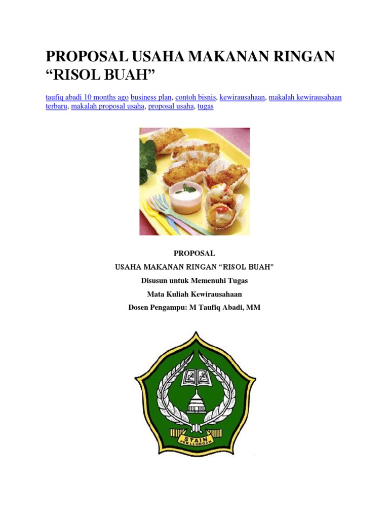 Contoh makalah kewirausahaan makanan. Camilan sehat nata nugget tahu proposal kewirausahaan makanan nugget tahu. 1623 business plan contoh bisnis kewirausahaan makalah kewirausahaan terbaru makalah proposal usaha proposal usaha tugas proposal usaha makanan ringan risol buah disusun untuk memenuhi tugas mata kuliah kewirausahaan dosen pengampu. Makanan yang akan dijual diusahakan selalu dalam keadaan segar karena itu makanan yang dijual tidak menggunakan bahan pengawet. Contoh proposal kewirausahaan bagi kalian yang mungkin tengah mencari contoh proposal makanan untuk memenuhi tugas mahasiswa ataupun untuk pengajuan proposal usaha pribadi. Makalah kewirausahaan lengkap by faisal 0658 16 comments. Kebetulan pada artikel kali ini saya akan memberikan contohnya secara lengkap kepada kalian semua.