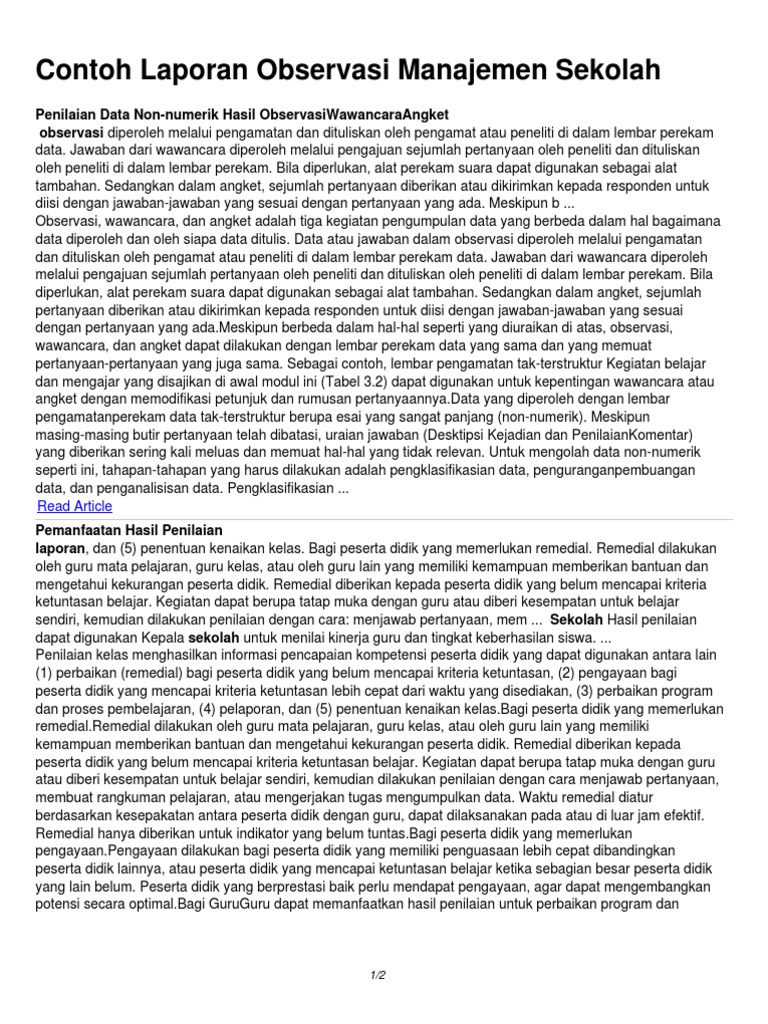 Contoh makalah observasi sekolah. Smkn 2 kota tasikmalaya merupakan sekolah menengah kejuruan yang terletak di jl. Manajemen keuangan merupakan salah satu substansi manajamen sekolah yang akan turut menentukan berjalannya kegiatan pendidikan di sekolah. Makalah laporan observasi 1 magang 1 nama kelompok. Makalahid bagaiamana membuat contoh laporan hasil observasi lingkungan sekolah yang sesuai dengan ketentuan. Administrasi perkantoran ilmu pendidikan makalah edit. Jika mendengar kata observasi maka yang ada di dalam pikiran adalah pengamatan terhadap suatu objekpengamatan yang dilakukan dengan berdasarkan beberapa poin yang sebelumnya sudah dibuat.