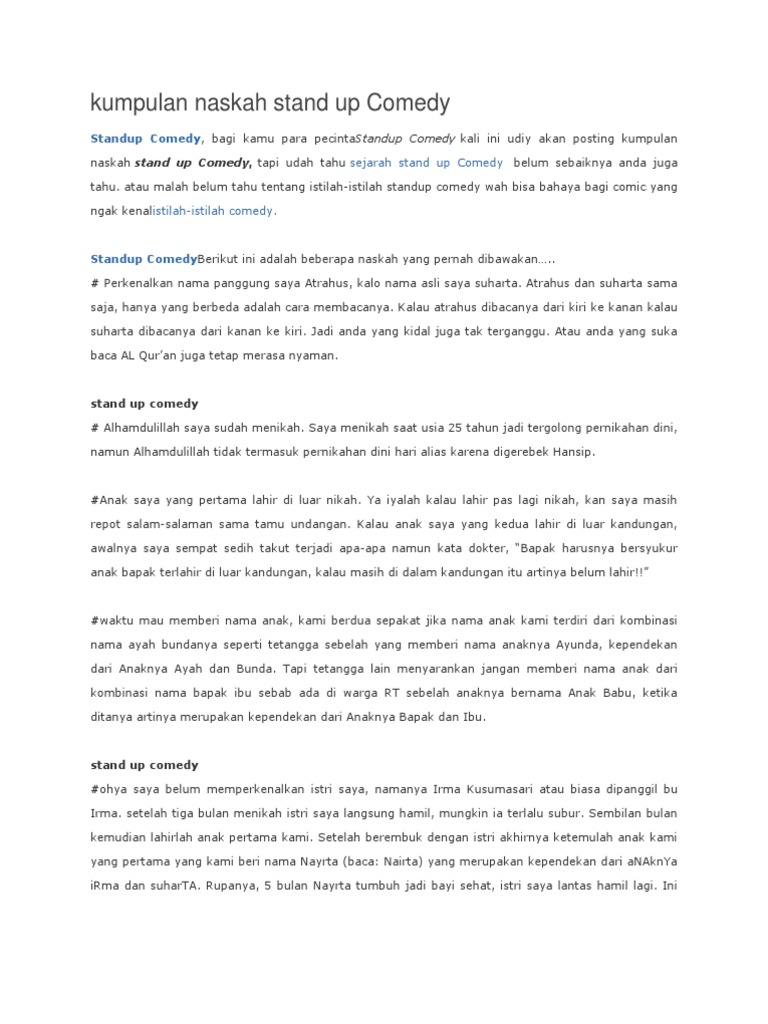 Kamu bisa mengeksplornya dengan gayamu sendiri. Contoh naskah materi stand up comedy dan video celotehan kocak para comic banyak beredar secara online di internet lewat youtube dan bisa di download secara gratis. Kamu bisa mengeksplornya dengan gayamu sendiri. Enak kalau bolos nggak ketahuan. Materi stand up comedy kami akan berikan materi ini kepada anda semua yang ingin sekali manggung menjadi stand up comedy dimana saat ini stand up comedy sangat tenar sekali dimana banyak sekali televisi di indonesia membuka kesempatan untuk bisa menjadi stand up comedy tunggal yang piawai dan bisa menjadi juara satu dan hal tersebut di hargai dengan uang hingga ratusan jutah rupiah untuk. Materi stand up comedy lucu tentang sekolah ini bukan contoh naskah teks kata kata untuk materi stand up komedi paling lucu ala comic komika tenar macam.
