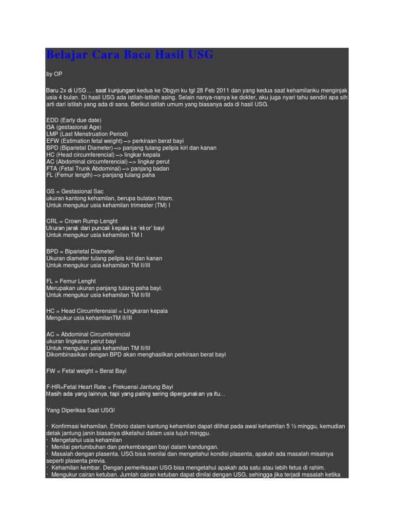 Tak ada salahnya anda memahami cara membaca hasil usg dan istilah lain yang berkaitan dengan usg yang akan anda jalani pada 9 bulan kehamilan ini. Ketika anda mencetak hasil pemeriksaan usg anda mungkin akan menemukan beberapa singkatan yang diambil dari bahasa inggris. Walimahinfo dalam masa kehamilan hampir semua ibu hamil mengetahui istilah usg tetapi tahukah apa itu usg. Lalu cara membaca hasil usg bagaimana yaa. Ga gestational age. Semua itu bisa menghasilkan rumus yang menunjukkan berapa berat janin di dalam kandungan.