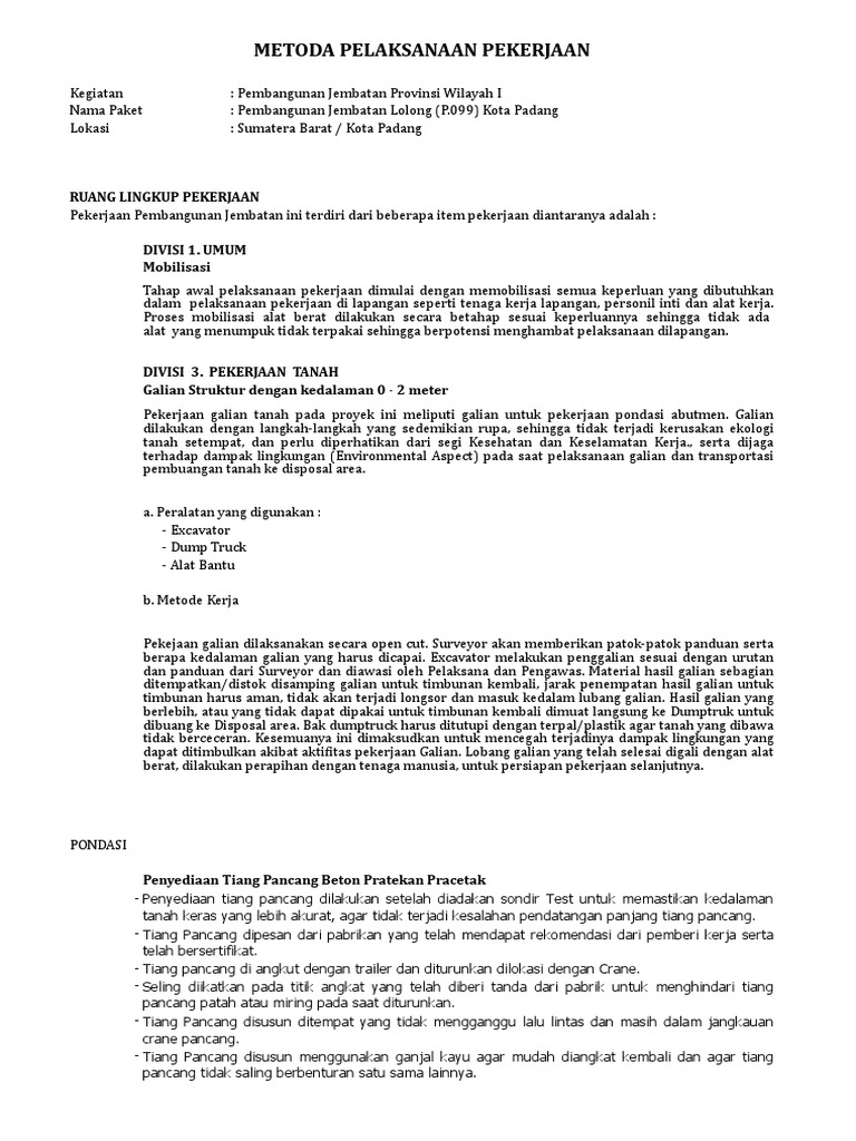 Contoh metode pelaksanaan pekerjaan jembatan. Academiaedu is a platform for academics to share research papers. Sebelum pelaksanaan pekerjaan pokok suatu proyek kontruksi pekerjaan pertama yang harus dilakukan adalah pekerjaan persiapan. Pendahuluan tahap pelaksanaan pekerjaan adalah tahap realisasi design rencana menjadi sebuah bangunan yang utuh. Metode pelaksanaan pekerjaan jembatan. Metode pelaksanaan pekerjaan beton ini biasanya digunakan untuk pekerjaan jalan dan jembatan digunakan untuk lantai kerja pada jembatan box culvert dan juga pada struktur pada seksion tertentu yang membutuhkan penanganan menggunakan beton. Contoh metode pelaksanaan rehab jembatan paling lengkap.