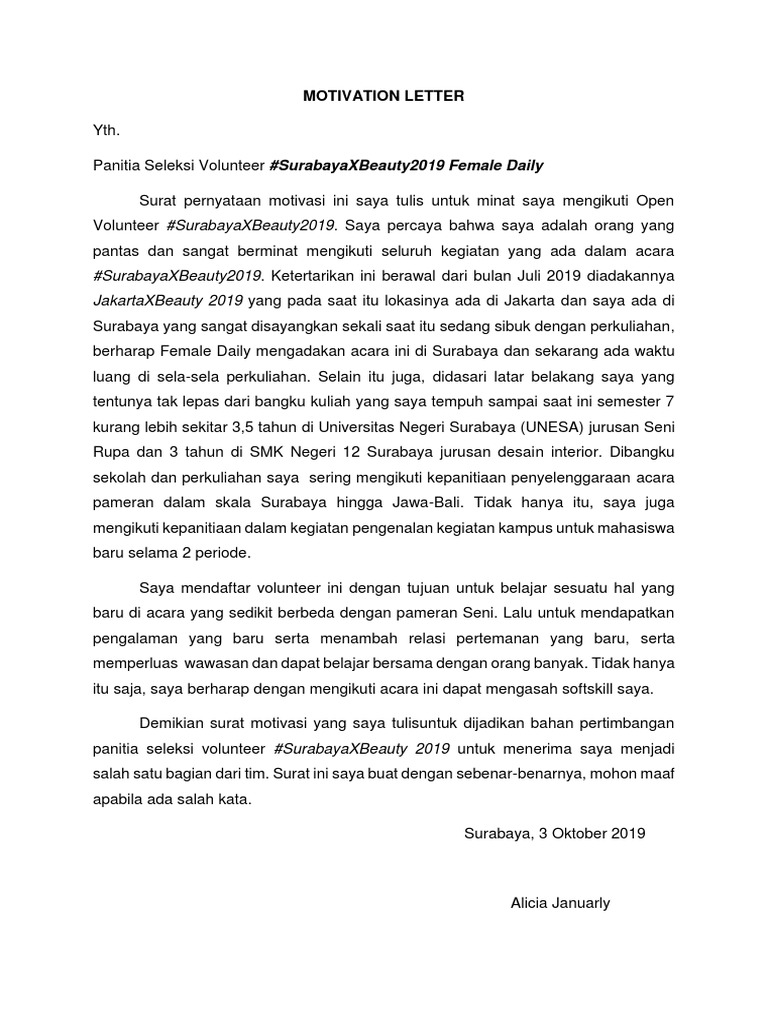 Contoh motivation letter untuk volunteer. Yaps silahkan dibaca semoga bermanfaat untuk semua pembacanya. Cara membuatnya dapat dilakukan dengan cara yang sangatlah mudah asalkan anda mengetahui memperhatikan aturan yang seharusnya ada di dalam motivation letter. By guru baru posted on 09052020. Motivation letter motlet adalah catatan motivasi atau alasan kuat yang mendasari seseorang untuk ingin bergabung dengan suatu oraganisasi atau kegiatan bahkan beasiswa dsb. It is an important document which is attached with a resume or a cv for various application purposes such as school college job etc. Contoh motivation letter yang disajikan di sini berasal dari dokumen dokumen yang perlu saya pelajari di luar negeri.