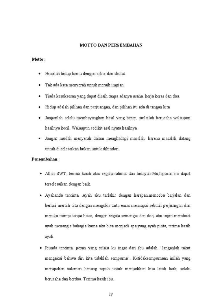 Untuk memudahkanmu dalam mengedit kami sertakan draft contoh halaman persembahan dalam tautan berikut ini. Unduh sebagai rtf pdf txt atau baca online dari scribd. Motto memang sangat penting walaupun beberapa menganggap remeh kalimat motto tersebut. Motto dan lembar persembahan motto dan persembahan. O setiap pekerjaan dapat diselesaikan dengan mudah bila dikerjakan tanpa keengganan.