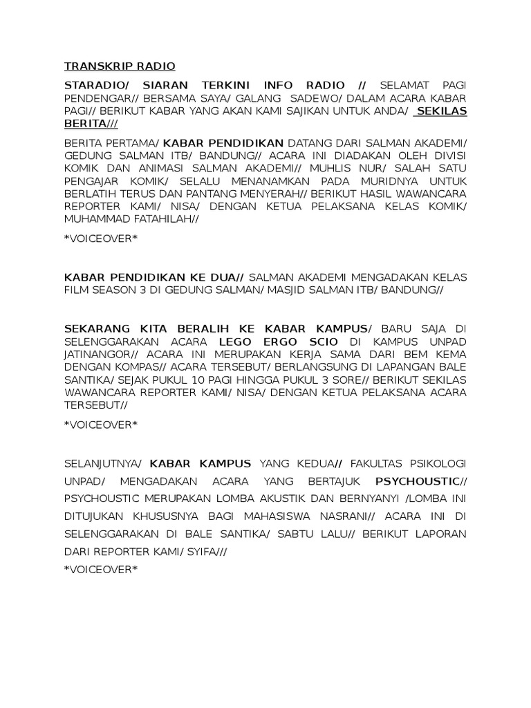 Contoh naskah berita terbaru. Contoh naskah berita televisi informasi pertama berikut ini adalah sebuah informasi yang baru saja kami dapat. Apabila anda mencari contoh naskah berita televisi terbaru misalnya naskah berita tv liputan 6 atau contoh teks berita untuk acara televisi yang baik dan benar maka kali ini akan kita bahas bersama tentang apa itu naskah berita yang baik secara penulisan maupun kalimatnya. Presenter berita tentunya harus mengetahui dari isi dari berita itu sendiri karena akan disampaikan kepada masyarakat luas. Untuk contoh naskah pembawa berita simaklah pembahasannya di bawah ini. Halo sobat kali ini admin akan memberikan 5 contoh teks berita singkat terbaru 2017. Menyusun contoh teks berita televisi bukanlah hal yang mudah untuk dilakukan misalnya contoh naskah berita liputan 6 terbaru atau berita rcti global tv tv one dan sebagainya yang tentunya memerlukan sumber referensi yang akurat serta talenta tersendiri dalam penyampaiannya.