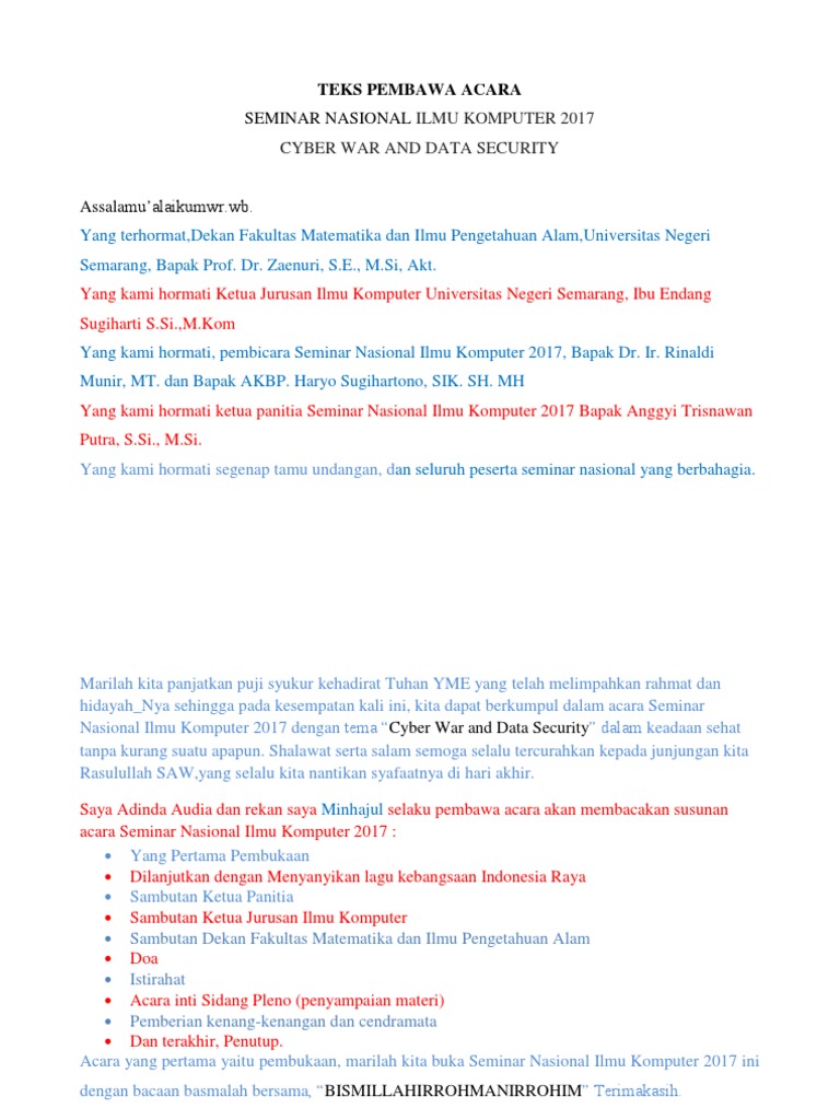 Naskah mc pembawa acara seminar nasional bahasa indonesia pada kesempatan kali ini kami akan memberikan contoh lengkap naskah mc pembawa acara untuk seminar nasional yang sudah lengkap bahasa indonesia. Its a precious chance for me to be your master of ceremony on this very special occcasion the seminar about global warming. Beberapa waktu yang lalu saya sempat didaulat menjadi mc satu acara di kantor. Kumpulan teks mc lengkap dengan berbagai tema. Pembukaan acara seminar pendidikan matematika fakultas keguruan dan ilmu pendidikan universitas pancasakti tegal assalamualaikum wr. Jadi kali ini gue bakal kasih contoh teks pembawa acara.