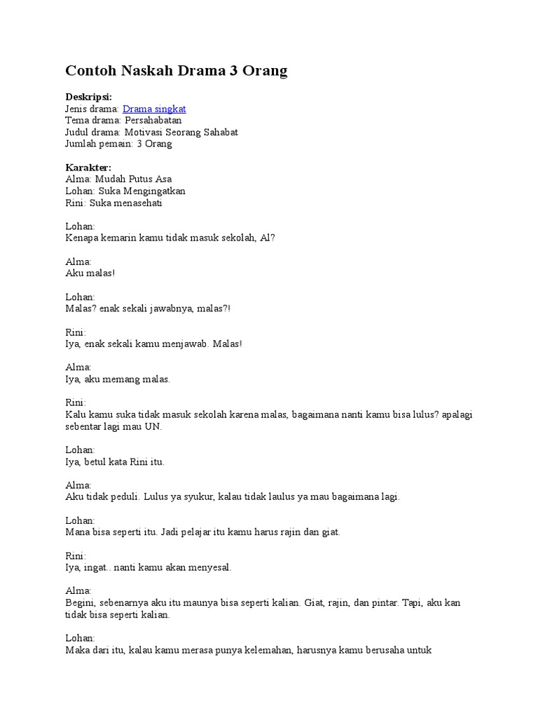 Melalui skrip ini para pemain drama berusaha untuk mengikuti alur cerita dan menjiwai karakter yang ia mainkan. Contoh naskah drama pendek dan singkat ini kisah menceritakan para pemuda yang berstatus sebagai santri yang tinggal dikamar yang namanya f3mereka adalah sahabat yang selalu kompak dan setia kawan. Contoh naskah drama drama persahabatan teater panjang komedi singkat dll hallo sahabat pembaca yang budiman pada kesempatan yang berbahagia kali ini kita akan membahas makalah tentang beberapa macam contoh naskah dramabagi teman teman yang suka dengan sastra pasti sudah tidak asing lagi dengan masalah drama ini. Contoh drama mungkin sebagian dari anda pernah melakukan drama ataupun pernah menonton pementasan drama. 7 contoh teks drama singkat dalam berbagai tema lengkap pementasan drama baik di tv ataupun teater selalu menggunakan panduan berupa teks drama. Alangkah baiknya saat kita mengetahui apakah drama itu.