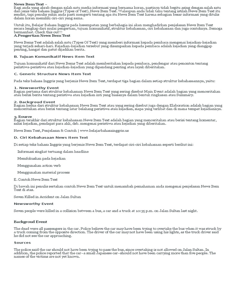 Inilah 5 contoh news item text lengkap dengan generic structure arti dan audio bacaan dalam format mp3 supaya bisa didownload dan digunakan untuk berlatih listening english. Jika anda seorang yang gemar membaca terlebih lagi membaca koran atau surat kabar lainnya. 6 contoh news item text singkat teks news item beserta strukturnya. Contoh news item text biasanya menggunakan past tense untuk memaparkan informasi di masa lampau. 7 contoh news item text singkat terbaru beserta artinya news item text adalah salah satu teks bahasa inggris yang berisi suatu informasi tentang suatu peristiwa atau kejadian sehari hari yang dianggap pantas dan penting untuk dijadikan berita. Meski arti yang ditulis disni terkesan kaku dan sangat baku tetapi penterjemahan ini bersifat sebagai.