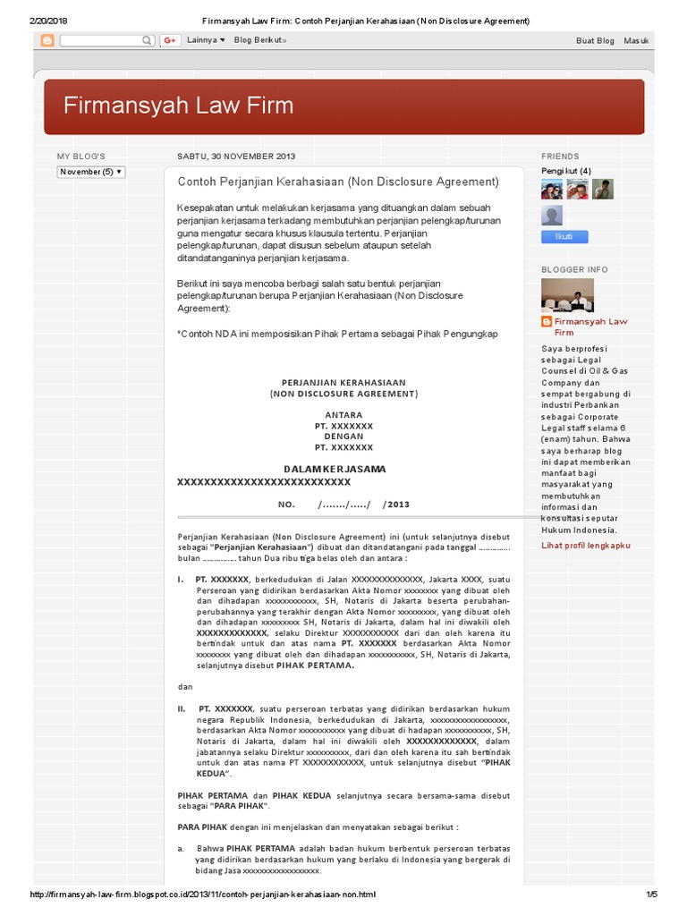 Surat non disclosure agreement atau yang biasa disingkat dengan nda adalah salah satu jenis dari surat perjanjian yang menyatakan bahwa seseorang tidak boleh melakukan pengutipan atau pemberitahuan isi dalam sebuah pekerjaan disclosure seperti yang tertera dalam surat perjanjian tersebutsecara ringkas surat non discolusre agreement memuat perjanjian yang menuyatakan bahwa seseorang diminta. This confidentiality agreement this agreement dated as of 2011 is made by and between ltd a company incorporated under the laws of a nd having its office located at company and recipient and pt. A non disclosure agreement nda or confidentiality agreement is a legally binding contract which protects trade secrets or other sensitive information from being revealed. Contoh perjanjian kerahasiaan non disclosure agreement kesepakatan untuk melakukan kerjasama yang dituangkan dalam sebuah perjanjian kerjasama terkadang membutuhkan perjanjian pelengkapturunan guna mengatur secara khusus klausula tertentu. Name of individual receiving information of address of individual or name of company receiving information a company registered in england under company number number on register of companies whose registered office is at address of office on the register of companies. Prima inti karsa abadi pika a company incorporated under the laws of indonesia and having its registered office at.