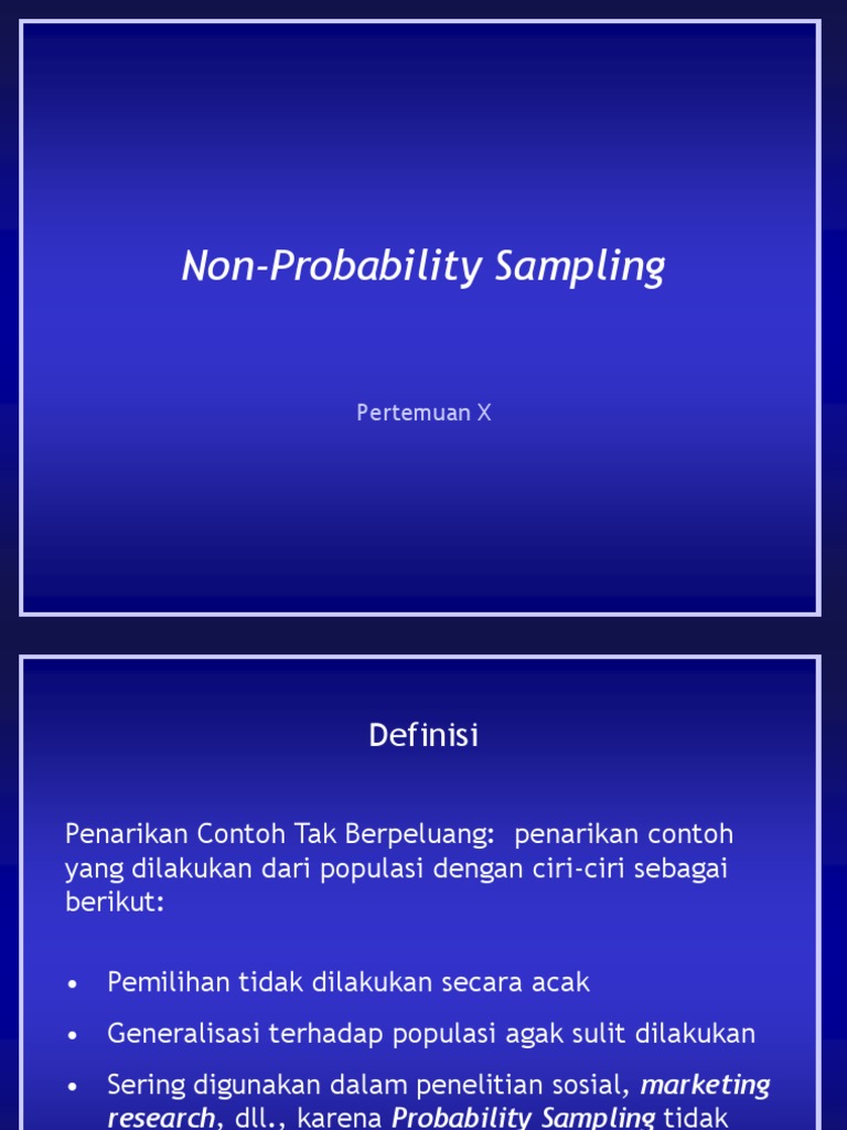 Non probability sampling merupakan teknik pengambilan sampel tidak dipilih secara acak. Non probability sampling is defined as a sampling technique in which the researcher selects samples based on the subjective judgment of the researcher rather than random selection. Purpossive sampling penarikan contoh bertujuan tidak semua populasi bisa dideteksi dengan jelas dimana mereka berada. Non probability sampling technique teknik pengambilan sampling non probabilitas teknik ini disebut non probabilitas hal ini karena pada proses pengumpulan sampel sampel tidak memberikan peluang yang sama untuk setiap individu dalam populasi. What is non probability sampling. Teknik sampling probabilitas probability sampling technique teknik ini dinamakan probabilitas karena dalam proses pengambilannya ada peluang yang sama yang dimiliki individu untuk mendapakan kesempatan menjadi sampel penelitian.
