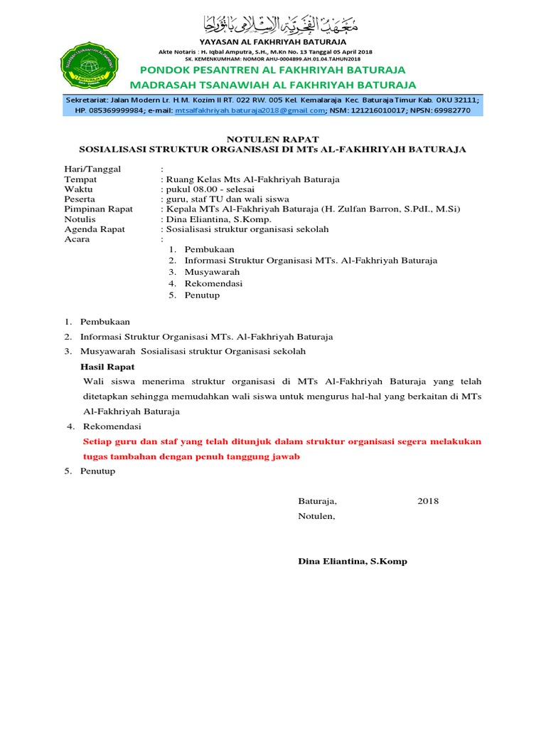 Organisasi tersebut akan hidup dan memiliki visi serta rencana ke depan dari rapat yang diselenggarakan. Notulen rapat merupakan dokumentasi penting bagi suatu organisasi apapun. Contoh notulen rapat selama ini dalam berbagai kegiatan kadang tidak lepas dari yang namanya notulen. Contoh notulen rapat yang baik dan benar baik dalam rapat organisasi sekolah atau osis yang dan masih banyak contoh yang lainya bisa sahabat cek dalam artikel kali ini. Sk surat keputusan notulen serta daftar hadir ini diperlukan untuk kebutuhan dalam rapat penyusunan dan penetapan struktur organisasi sekolah madrasah. Notulen merupakan suatu catatan yang biasanya ada dalam forum diskusi rapat organisasi rapat kantor rapat sekolah dan lain sebagainya.