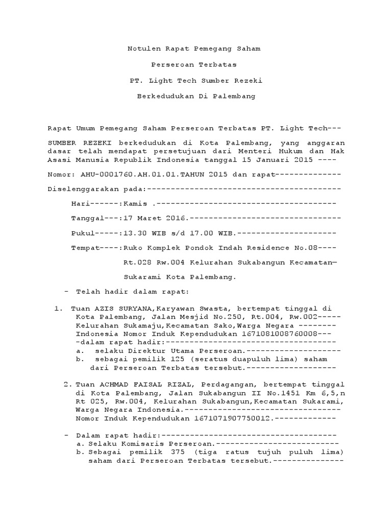 Contoh notulen rups pt. Artikel contoh notulen rapat perusahaan swasta. Dimana untuk rups tahunan dilaksanakan tiap tahun dengan agenda perihal pertanggung jawaban direksi dan komisaris perseroan dalam menjalankan tugas dan fungsinya selama 1 tahun program kerja untuk tahun ke depan penunjukan akuntan publik dll. Sederhananya dalam rapat umum pemegang saham dimungkinkan adanya komunikasi langsungsaling tukar ide antara peserta rapat pemegang saham nah dari pembicaraan hasil rapat itulah nanti dituliskan ke dalam suatu notulen rapat yang nantinya kita kenal dengan notulen rapat umum pemegang saham. Contoh notulen rapat perusahaan swasta lengkap. Pasal 78 ayat 1 menyatakan bahwa.