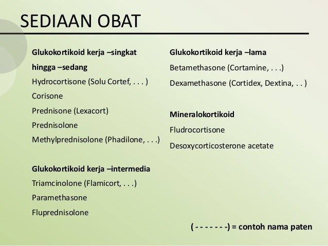 Dexamethasone prednison metilprednisolon hidrokortison betametason triamsinolon dan mungkin pernah mengonsumsinya atas alasan tertentukesemua obat obatan ini tergolong dalam kategori obat kortikosteroid yang mampu mengatasi banyak masalah kesehatan. Tergantung pada tujuan pengobatan spesifik obat obat ini dapat digunakan secara oral disuntikkan dihirup atau dioleskan menurut mayo clinic. Obat generasi kedua juga lebih minim risiko efek samping dan tidak begitu membuat ngantuk sehabis diminum. Contoh obat mineral kortikoid dan glukortikoid.
